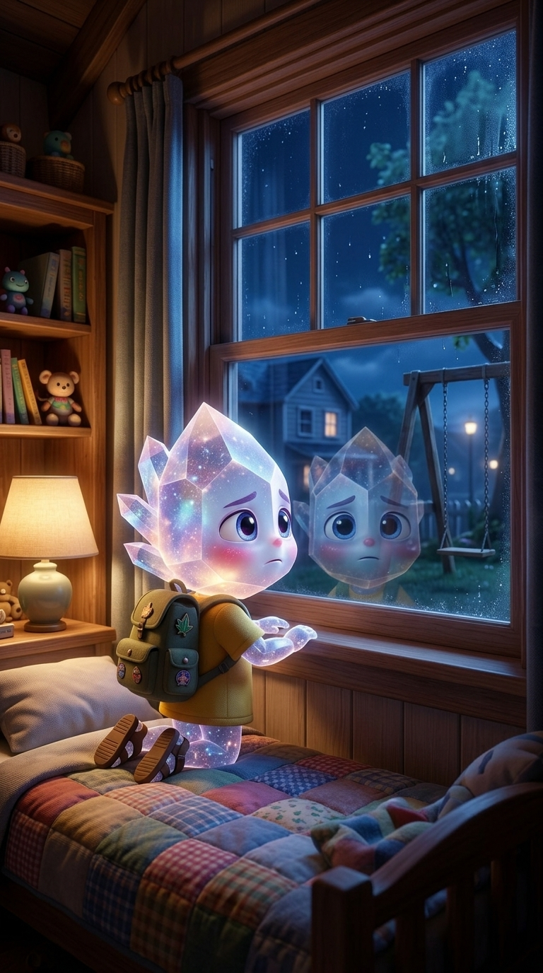 Art style: Кинематографичная 3D-анимация в стиле Pixar, с .... Кварцик стоит на коленях на кровати и смотрит в окно. За окном глубокая ночь, виден соседний дом и качели во дворе. В стекле отражается грустное лицо Кварца. Комната уютная, в стиле Pixar. ━━━━━━━━━━━━━━━━━━━━━━━━━━━━━━━━━━━━━━ FINAL STYLE ENFORCEMENT (this is the authoritative rendering directive — it overrides any style wording elsewhere in the prompt): Render this image entirely in "Кинематографичная 3D-анимация в стиле Pixar, с ..." style. Match the lighting grammar, material response, colour science, level of realism / stylisation, line weight, and shading model typical of "Кинематографичная 3D-анимация в стиле Pixar, с ...". Keep the subject, composition, camera angle, lighting direction, and colour palette from the description above — but EVERY surface, skin, fabric, material, and environmental element must be rendered in the "Кинематографичная 3D-анимация в стиле Pixar, с ..." idiom, not in any other medium. Character appearance reference (MUST match exactly): - Кварцик: Strong rule: style --- 3D Pixar, vibrant colors, highly detailed anthr... ---. Small anthropomorphic Quartz crystal child, wearing a yellow t-shirt and a tiny backpack, huge cute expressive eyes, 3D Pixar style Reference images context (match the visual style and elements from these): - Quartz's Humble Cottage (general): A small, cozy, and humble cottage with weathered wooden siding, a simple porch, and a warm, inviting atmosphere. Pixar-style 3D animation, highly detailed exterior, isolated on a clean background, cinematic lighting. - Backyard Swingset (general): A simple wooden A-frame swingset with two seats hanging from metal chains. The wood is slightly worn. Pixar-style 3D animation, clean lines, high detail, isolated on a simple grassy patch background. - Obsidian's Luxury Interior (general): A high-end, modern luxury interior featuring black marble surfaces, sleek minimalist architecture, and large panoramic glass windows. Pixar-style 3D animation, cold and sharp cinematic lighting, polished textures. - Quartz's Cozy Interior Style (general): A warm and cluttered domestic interior with soft wooden textures, colorful fabrics, and a lived-in feel. Pixar-style 3D animation, soft morning sunlight, highly detailed furniture and home decor. - Уведомление о выселении (general): A set of formal legal documents with a prominent red 'EVICTION' stamp and official seals, alongside a rough wooden sign with hand-painted lettering. Pixar-style 3D animation, high texture detail on paper and wood grain.