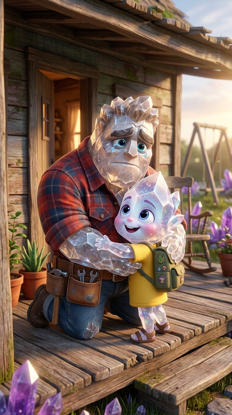 Art style: Кинематографичная 3D-анимация в стиле Pixar, с .... Кварц, со слезами на глазах, крепко обнимает Кварцика на пороге своего скромного, но уютного дома. Кварцик счастливо прижимается к нему. Сцена наполнена теплым светом и любовью. Стиль Pixar. ━━━━━━━━━━━━━━━━━━━━━━━━━━━━━━━━━━━━━━ FINAL STYLE ENFORCEMENT (this is the authoritative rendering directive — it overrides any style wording elsewhere in the prompt): Render this image entirely in "Кинематографичная 3D-анимация в стиле Pixar, с ..." style. Match the lighting grammar, material response, colour science, level of realism / stylisation, line weight, and shading model typical of "Кинематографичная 3D-анимация в стиле Pixar, с ...". Keep the subject, composition, camera angle, lighting direction, and colour palette from the description above — but EVERY surface, skin, fabric, material, and environmental element must be rendered in the "Кинематографичная 3D-анимация в стиле Pixar, с ..." idiom, not in any other medium. Character appearance reference (MUST match exactly): - Кварц: Strong rule: style --- 3D Pixar, vibrant colors, highly detailed anthr... ---. Anthropomorphic rough Quartz crystal character, male, sturdy build, wearing a plaid flannel shirt and a leather tool belt, big expressive sad eyes, 3D Pixar style - Кварцик: Strong rule: style --- 3D Pixar, vibrant colors, highly detailed anthr... ---. Small anthropomorphic Quartz crystal child, wearing a yellow t-shirt and a tiny backpack, huge cute expressive eyes, 3D Pixar style Reference images context (match the visual style and elements from these): - Quartz's Humble Cottage (general): A small, cozy, and humble cottage with weathered wooden siding, a simple porch, and a warm, inviting atmosphere. Pixar-style 3D animation, highly detailed exterior, isolated on a clean background, cinematic lighting. - Backyard Swingset (general): A simple wooden A-frame swingset with two seats hanging from metal chains. The wood is slightly worn. Pixar-style 3D animation, clean lines, high detail, isolated on a simple grassy patch background. - Obsidian's Luxury Interior (general): A high-end, modern luxury interior featuring black marble surfaces, sleek minimalist architecture, and large panoramic glass windows. Pixar-style 3D animation, cold and sharp cinematic lighting, polished textures. - Quartz's Cozy Interior Style (general): A warm and cluttered domestic interior with soft wooden textures, colorful fabrics, and a lived-in feel. Pixar-style 3D animation, soft morning sunlight, highly detailed furniture and home decor. - Уведомление о выселении (general): A set of formal legal documents with a prominent red 'EVICTION' stamp and official seals, alongside a rough wooden sign with hand-painted lettering. Pixar-style 3D animation, high texture detail on paper and wood grain.
