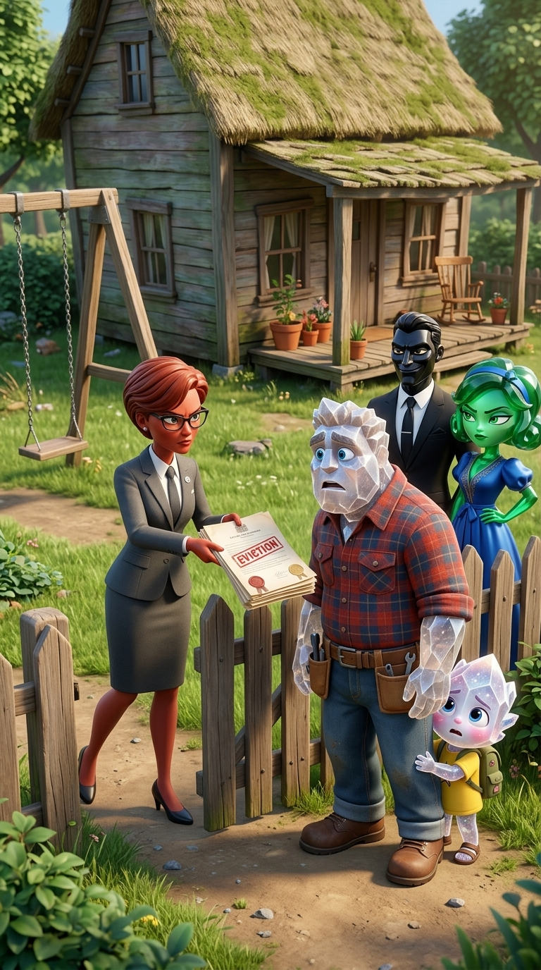 Art style: Кинематографичная 3D-анимация в стиле Pixar, с .... Обсидиан, Изумруд и юрист Яшма стоят у забора дома Кварца. Яшма показывает Кварцу документы с печатью "ВЫСЕЛЕНИЕ". Кварц в шоке, Кварцик испуганно прячется за него. Изумруд смотрит с презрением. ━━━━━━━━━━━━━━━━━━━━━━━━━━━━━━━━━━━━━━ FINAL STYLE ENFORCEMENT (this is the authoritative rendering directive — it overrides any style wording elsewhere in the prompt): Render this image entirely in "Кинематографичная 3D-анимация в стиле Pixar, с ..." style. Match the lighting grammar, material response, colour science, level of realism / stylisation, line weight, and shading model typical of "Кинематографичная 3D-анимация в стиле Pixar, с ...". Keep the subject, composition, camera angle, lighting direction, and colour palette from the description above — but EVERY surface, skin, fabric, material, and environmental element must be rendered in the "Кинематографичная 3D-анимация в стиле Pixar, с ..." idiom, not in any other medium. Character appearance reference (MUST match exactly): - Кварц: Strong rule: style --- 3D Pixar, vibrant colors, highly detailed anthr... ---. Anthropomorphic rough Quartz crystal character, male, sturdy build, wearing a plaid flannel shirt and a leather tool belt, big expressive sad eyes, 3D Pixar style - Кварцик: Strong rule: style --- 3D Pixar, vibrant colors, highly detailed anthr... ---. Small anthropomorphic Quartz crystal child, wearing a yellow t-shirt and a tiny backpack, huge cute expressive eyes, 3D Pixar style - Изумруд: Strong rule: style --- 3D Pixar, vibrant colors, highly detailed anthr... ---. Anthropomorphic polished Emerald gemstone character, female, elegant, wearing a stylish blue dress, sharp and expressive judgmental eyes, 3D Pixar style - Обсидиан: Strong rule: style --- 3D Pixar, vibrant colors, highly detailed anthr... ---. Anthropomorphic sleek black Obsidian gemstone character, male, wearing a sharp black tailored suit, smug and arrogant expressive eyes, 3D Pixar style - Яшма: Strong rule: style --- Кинематографичная 3D-анимация в стиле Pixar, с ... ---. Строгая и деловая антропоморфная женщина, сделанная из красной яшмы с темными прожилками. Носит очки в строгой оправе. Взгляд деловой и холодный. Одета в строгий серый деловой костюм с юбкой. Reference images context (match the visual style and elements from these): - Quartz's Humble Cottage (general): A small, cozy, and humble cottage with weathered wooden siding, a simple porch, and a warm, inviting atmosphere. Pixar-style 3D animation, highly detailed exterior, isolated on a clean background, cinematic lighting. - Backyard Swingset (general): A simple wooden A-frame swingset with two seats hanging from metal chains. The wood is slightly worn. Pixar-style 3D animation, clean lines, high detail, isolated on a simple grassy patch background. - Obsidian's Luxury Interior (general): A high-end, modern luxury interior featuring black marble surfaces, sleek minimalist architecture, and large panoramic glass windows. Pixar-style 3D animation, cold and sharp cinematic lighting, polished textures. - Quartz's Cozy Interior Style (general): A warm and cluttered domestic interior with soft wooden textures, colorful fabrics, and a lived-in feel. Pixar-style 3D animation, soft morning sunlight, highly detailed furniture and home decor. - Уведомление о выселении (general): A set of formal legal documents with a prominent red 'EVICTION' stamp and official seals, alongside a rough wooden sign with hand-painted lettering. Pixar-style 3D animation, high texture detail on paper and wood grain.