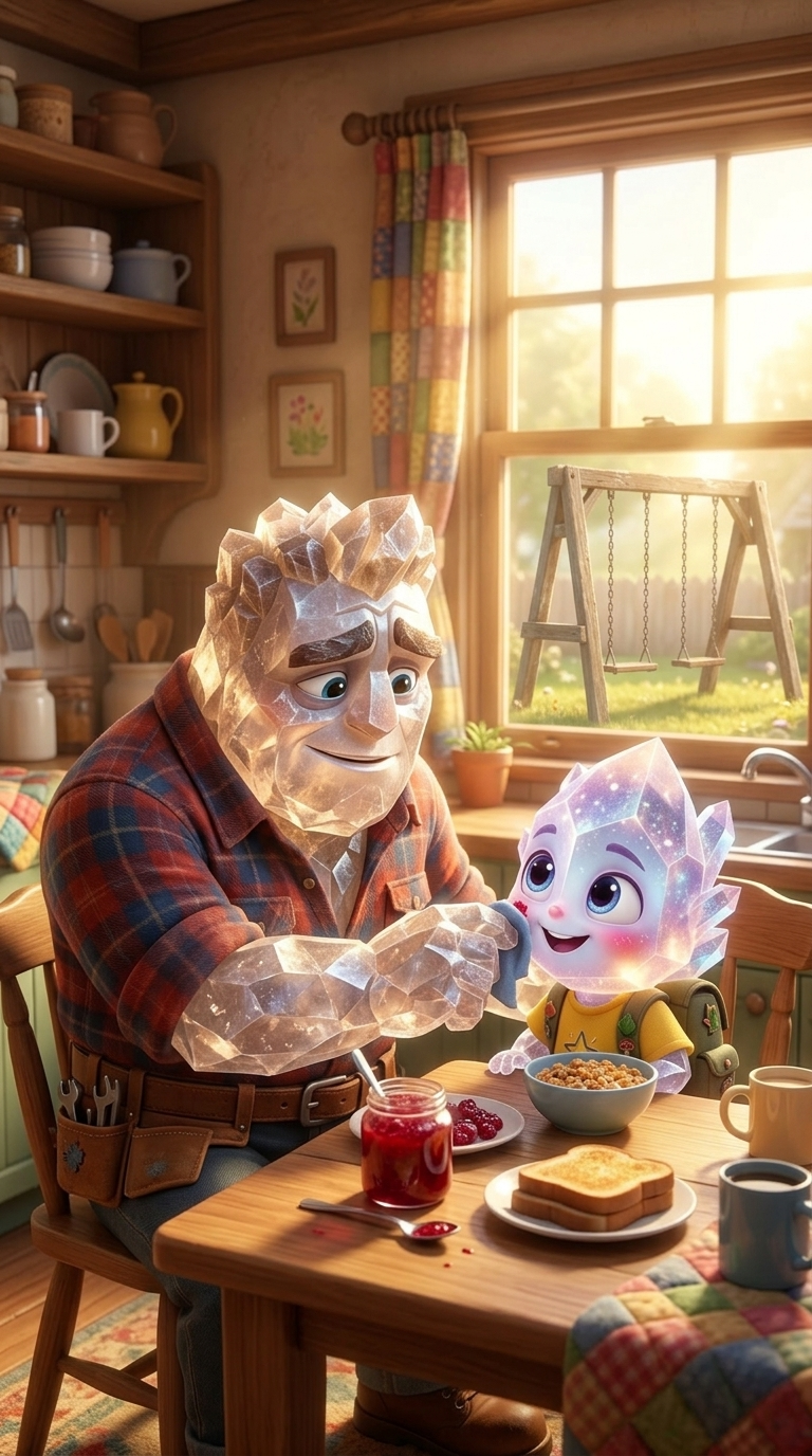 Art style: Кинематографичная 3D-анимация в стиле Pixar, с .... Кварц и Кварцик счастливо завтракают на своей уютной, залитой утренним солнцем кухне. Кварц с нежностью поправляет щечку Кварцика, испачканную в джеме. За окном видны качели. ━━━━━━━━━━━━━━━━━━━━━━━━━━━━━━━━━━━━━━ FINAL STYLE ENFORCEMENT (this is the authoritative rendering directive — it overrides any style wording elsewhere in the prompt): Render this image entirely in "Кинематографичная 3D-анимация в стиле Pixar, с ..." style. Match the lighting grammar, material response, colour science, level of realism / stylisation, line weight, and shading model typical of "Кинематографичная 3D-анимация в стиле Pixar, с ...". Keep the subject, composition, camera angle, lighting direction, and colour palette from the description above — but EVERY surface, skin, fabric, material, and environmental element must be rendered in the "Кинематографичная 3D-анимация в стиле Pixar, с ..." idiom, not in any other medium. Character appearance reference (MUST match exactly): - Кварц: Strong rule: style --- 3D Pixar, vibrant colors, highly detailed anthr... ---. Anthropomorphic rough Quartz crystal character, male, sturdy build, wearing a plaid flannel shirt and a leather tool belt, big expressive sad eyes, 3D Pixar style - Кварцик: Strong rule: style --- 3D Pixar, vibrant colors, highly detailed anthr... ---. Small anthropomorphic Quartz crystal child, wearing a yellow t-shirt and a tiny backpack, huge cute expressive eyes, 3D Pixar style Reference images context (match the visual style and elements from these): - Quartz's Humble Cottage (general): A small, cozy, and humble cottage with weathered wooden siding, a simple porch, and a warm, inviting atmosphere. Pixar-style 3D animation, highly detailed exterior, isolated on a clean background, cinematic lighting. - Backyard Swingset (general): A simple wooden A-frame swingset with two seats hanging from metal chains. The wood is slightly worn. Pixar-style 3D animation, clean lines, high detail, isolated on a simple grassy patch background. - Obsidian's Luxury Interior (general): A high-end, modern luxury interior featuring black marble surfaces, sleek minimalist architecture, and large panoramic glass windows. Pixar-style 3D animation, cold and sharp cinematic lighting, polished textures. - Quartz's Cozy Interior Style (general): A warm and cluttered domestic interior with soft wooden textures, colorful fabrics, and a lived-in feel. Pixar-style 3D animation, soft morning sunlight, highly detailed furniture and home decor. - Уведомление о выселении (general): A set of formal legal documents with a prominent red 'EVICTION' stamp and official seals, alongside a rough wooden sign with hand-painted lettering. Pixar-style 3D animation, high texture detail on paper and wood grain.