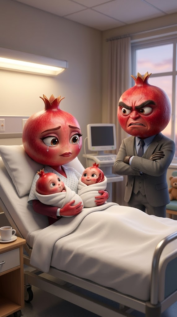 Art style: Animación 3D estilo Pixar. Сцена 3D в стиле Pixar. Больничная палата. Мама Гранат плачет в кровати с двумя гранатовыми младенцами как с референса. Папа Гранат испуган и зол. Мягкое клиническое освещение. ━━━━━━━━━━━━━━━━━━━━━━━━━━━━━━━━━━━━━━ FINAL STYLE ENFORCEMENT (this is the authoritative rendering directive — it overrides any style wording elsewhere in the prompt): Render this image entirely in "Animación 3D estilo Pixar" style. Match the lighting grammar, material response, colour science, level of realism / stylisation, line weight, and shading model typical of "Animación 3D estilo Pixar". Keep the subject, composition, camera angle, lighting direction, and colour palette from the description above — but EVERY surface, skin, fabric, material, and environmental element must be rendered in the "Animación 3D estilo Pixar" idiom, not in any other medium. Character appearance reference (MUST match exactly): - Mamá Granada: Strong rule: style --- Animación 3D estilo Pixar ---. Personaje 3D Pixar. Cabeza de granada roja, ojos grandes, maquillaje elegante, ropa de hospital y luego traje sastre burdeos. Iluminación suave. - Papá Granada: Strong rule: style --- Animación 3D estilo Pixar ---. Strong rule: style --- Animación 3D estilo Pixar ---. Personaje 3D Pixar. Cabeza de granada roja, cejas pobladas, expresión severa, camisa azul y luego traje gris. Iluminación dramática. - цклый гранат: Strong rule: style --- Animación 3D estilo Pixar ---. Strong rule: style --- Animación 3D estilo Pixar ---. cute baby character shaped like a whole pomegranate, wrapped in a soft white swaddle blanket, only the small face and top crown of the pomegranate visible, smooth glossy red skin, big expressive eyes, soft cheeks, innocent baby expression, tiny size, lying like a newborn, Pixar style 3D animation, ultra detailed, soft cinematic lighting, shallow depth of field, warm cozy atmosphere negative: damaged fruit, cracks, scary, realistic fruit texture, gore - надломленый гранат: Strong rule: style --- Animación 3D estilo Pixar ---. cute baby character shaped like a slightly cracked pomegranate, wrapped in a soft white swaddle blanket, small natural crack on the body with visible glossy red seeds inside, still adorable and not scary, big emotional eyes, soft baby face, tiny newborn proportions, Pixar style 3D animation, highly detailed, soft lighting, warm hospital atmosphere negative: gore, horror, too realistic fruit, aggressive crack, messy seeds