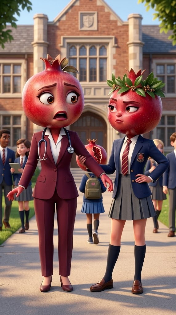 Art style: Animación 3D estilo Pixar. Escena 3D Pixar. Exterior de escuela. Mamá Granada elegante mira en shock hacia el fondo donde camina Granada Agrietada. Su hija perfecta la jala del brazo. ━━━━━━━━━━━━━━━━━━━━━━━━━━━━━━━━━━━━━━ FINAL STYLE ENFORCEMENT (this is the authoritative rendering directive — it overrides any style wording elsewhere in the prompt): Render this image entirely in "Animación 3D estilo Pixar" style. Match the lighting grammar, material response, colour science, level of realism / stylisation, line weight, and shading model typical of "Animación 3D estilo Pixar". Keep the subject, composition, camera angle, lighting direction, and colour palette from the description above — but EVERY surface, skin, fabric, material, and environmental element must be rendered in the "Animación 3D estilo Pixar" idiom, not in any other medium. Character appearance reference (MUST match exactly): - Mamá Granada: Strong rule: style --- Animación 3D estilo Pixar ---. Personaje 3D Pixar. Cabeza de granada roja, ojos grandes, maquillaje elegante, ropa de hospital y luego traje sastre burdeos. Iluminación suave. - Granada Agrietada: Strong rule: style --- Animación 3D estilo Pixar ---. Strong rule: style --- Animación 3D estilo Pixar ---. Strong rule: style --- Animación 3D estilo Pixar ---. Strong rule: style --- Animación 3D estilo Pixar ---. Personaje 3D Pixar. Adolescente con cabeza de granada, gran grieta mostrando semillas rubí, ropa escolar modesta, expresión tímida. Iluminación natural. женского пола должна быть - Granada Perfecta: Strong rule: style --- Animación 3D estilo Pixar ---. Strong rule: style --- Animación 3D estilo Pixar ---. Strong rule: style --- Animación 3D estilo Pixar ---. Personaje 3D Pixar. Adolescente con cabeza de granada impecable, corona de hojas perfecta, uniforme escolar de élite, actitud altiva. Iluminación brillante. она должна быть женского пола