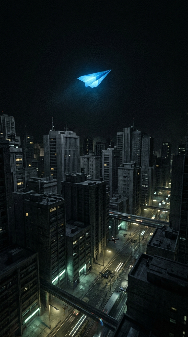 Art style: Cinematic Realism, Cyberpunk, Documentary, Dark.... Кинематографический реализм, светящийся синий бумажный самолетик, летящий высоко в темном ночном небе, далеко над городом-лабиринтом из серых, строгих бюрократических зданий. ━━━━━━━━━━━━━━━━━━━━━━━━━━━━━━━━━━━━━━ FINAL STYLE ENFORCEMENT (this is the authoritative rendering directive — it overrides any style wording elsewhere in the prompt): Render this image entirely in "Cinematic Realism, Cyberpunk, Documentary, Dark..." style. Match the lighting grammar, material response, colour science, level of realism / stylisation, line weight, and shading model typical of "Cinematic Realism, Cyberpunk, Documentary, Dark...". Keep the subject, composition, camera angle, lighting direction, and colour palette from the description above — but EVERY surface, skin, fabric, material, and environmental element must be rendered in the "Cinematic Realism, Cyberpunk, Documentary, Dark..." idiom, not in any other medium.