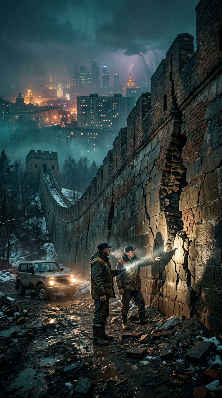 Art style: Cinematic Realism, Cyberpunk, Documentary, Dark.... В духе кинореализма, массивная, внушительная стена , напоминающая Великую Китайскую стену, но на ее поверхности образуются большие трещины. Никакого киберпанка!! Действия происходят в России, а конкретно в Москве. ━━━━━━━━━━━━━━━━━━━━━━━━━━━━━━━━━━━━━━ FINAL STYLE ENFORCEMENT (this is the authoritative rendering directive — it overrides any style wording elsewhere in the prompt): Render this image entirely in "Cinematic Realism, Cyberpunk, Documentary, Dark..." style. Match the lighting grammar, material response, colour science, level of realism / stylisation, line weight, and shading model typical of "Cinematic Realism, Cyberpunk, Documentary, Dark...". Keep the subject, composition, camera angle, lighting direction, and colour palette from the description above — but EVERY surface, skin, fabric, material, and environmental element must be rendered in the "Cinematic Realism, Cyberpunk, Documentary, Dark..." idiom, not in any other medium.