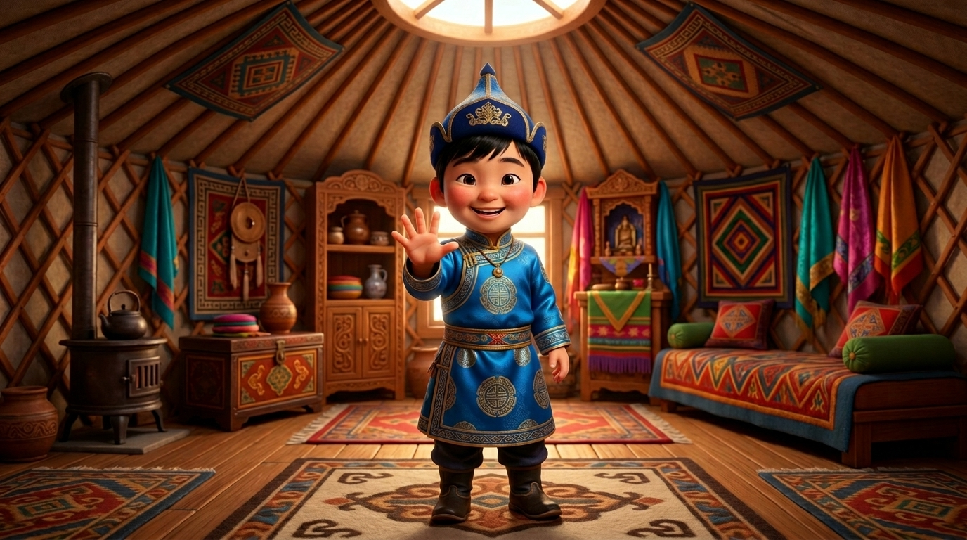 Art style: 3D Pixar. Средний план Баира, который снова стоит в центре юрты. Он сжимает руку в кулак, а затем широко раскрывает ладонь, показывая все пять пальцев. Его лицо светится гордостью и радостью. Камера немного отъезжает назад, открывая больше пространства комнаты. Освещение становится более торжественным и ярким. Цвета насыщенные: лазурный, солнечный желтый и глубокий коричневый цвет дерева. ━━━━━━━━━━━━━━━━━━━━━━━━━━━━━━━━━━━━━━ FINAL STYLE ENFORCEMENT (this is the authoritative rendering directive — it overrides any style wording elsewhere in the prompt): Render this image entirely in "3D Pixar" style. Match the lighting grammar, material response, colour science, level of realism / stylisation, line weight, and shading model typical of "3D Pixar". Keep the subject, composition, camera angle, lighting direction, and colour palette from the description above — but EVERY surface, skin, fabric, material, and environmental element must be rendered in the "3D Pixar" idiom, not in any other medium. Character appearance reference (MUST match exactly): - Баир: Strong rule: style --- 3D Pixar ---. Маленький бурятский мальчик лет семи с круглым лицом, яркими карими глазами и густыми черными волосами под традиционной шапкой. Он одет в современный стилизованный дэгэл синего цвета с золотистыми узорами. Фон — светлый интерьер современной юрты с элементами национального декора и мягким солнечным светом. Освещение теплое и мягкое, создающее атмосферу уюта и радости. Мальчик выглядит энергичным и любознательным, на его лице широкая, искренняя улыбка. Стиль изображения чистый и детализированный, с акцентом на текстуру ткани и блеск в глазах.