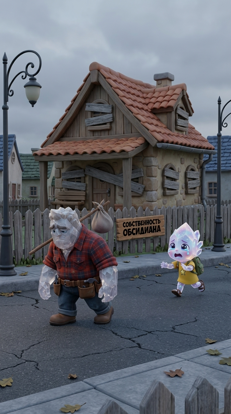 Art style: 3D Pixar Animation. Кварц с небольшим узелком за плечом уходит по пустынной дороге. Его спина сгорблена от горя. Дом заколочен, на заборе висит табличка 'СОБСТВЕННОСТЬ ОБСИДИАНА'. Кварцик бежит за ним, плача. ━━━━━━━━━━━━━━━━━━━━━━━━━━━━━━━━━━━━━━ FINAL STYLE ENFORCEMENT (this is the authoritative rendering directive — it overrides any style wording elsewhere in the prompt): Render this image entirely in "3D Pixar Animation" style. Match the lighting grammar, material response, colour science, level of realism / stylisation, line weight, and shading model typical of "3D Pixar Animation". Keep the subject, composition, camera angle, lighting direction, and colour palette from the description above — but EVERY surface, skin, fabric, material, and environmental element must be rendered in the "3D Pixar Animation" idiom, not in any other medium. Character appearance reference (MUST match exactly): - Кварц: Strong rule: style --- 3D Pixar, vibrant colors, highly detailed anthr... ---. Anthropomorphic rough Quartz crystal character, male, sturdy build, wearing a plaid flannel shirt and a leather tool belt, big expressive sad eyes, 3D Pixar style - Кварцик: Strong rule: style --- 3D Pixar, vibrant colors, highly detailed anthr... ---. Small anthropomorphic Quartz crystal child, wearing a yellow t-shirt and a tiny backpack, huge cute expressive eyes, 3D Pixar style Reference images context (match the visual style and elements from these): - reference photo (general): use as visual reference for setting, objects, and atmosphere - Роскошный черный седан (prop): Черный представительский автомобиль с хромированной решеткой радиатора и многоспицевыми дисками, расположенный в минималистичной студии с мягким теплым освещением. Изображение подчеркивает элегантность и премиальный статус объекта через игру света на глянцевом кузове. - Деревянные качели (prop): Деревянные качели с двумя черными сиденьями на желтых веревках, расположенные на размытом фоне зелени и неба. Конструкция выполнена из светлого дерева с видимой текстурой. - Стилизованная стройплощадка деревянного дома (location): Трехмерная модель строящегося деревянного дома в мультяшном стиле с антропоморфными инструментами на переднем плане. Изображение выполнено в теплых древесных тонах на нежно-голубом фоне, создавая дружелюбную и игровую атмосферу. - Quartz's Cozy Cottage (general): A small, charming cottage in 3D Pixar animation style. Built with warm stone and wood, featuring a gabled roof and a small front porch. The house has an inviting, lived-in feel with soft rounded edges and warm glowing windows. Isolated on a clean white background, highly detailed 3D render. - Backyard Swing Set (general): A simple wooden tree swing in 3D Pixar animation style. A smooth wooden plank seat suspended by two thick, textured ropes. The wood shows a gentle grain and slightly weathered edges. Isolated on a clean white background, vibrant colors, high-quality 3D render. - Eviction Notice and Property Sign (general): A collection of legal documents with a prominent red 'EVICTION' stamp alongside a wooden sign that reads 'PROPERTY OF OBSIDIAN' in bold, sharp black corporate lettering. 3D Pixar animation style, isolated on a white background, high-quality textures. все надписи на русском языке - Neighborhood Street (general): A stylized suburban road in 3D Pixar animation style. Features smooth asphalt, concrete curbs, and elegant street lamps with a warm yellow glow. The environment is clean, slightly whimsical, and peaceful. Isolated perspective, 3D render.