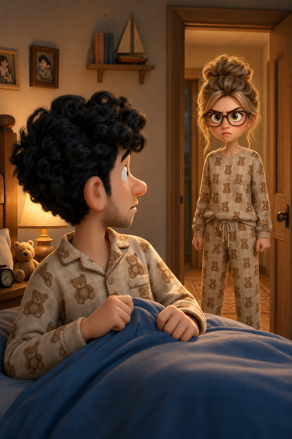 Art style: Stylized 3D character art. Спальня в вечернее время. Мужчина в пижаме лежит под голубым одеялом. В открытых дверях стоит женщина в и сердитым взглядом. Теплый свет от настольной лампы освещает комнату, создавая уютную, но напряженную атмосферу. ━━━━━━━━━━━━━━━━━━━━━━━━━━━━━━━━━━━━━━ FINAL STYLE ENFORCEMENT (this is the authoritative rendering directive — it overrides any style wording elsewhere in the prompt): Render this image entirely in "Stylized 3D character art" style. Match the lighting grammar, material response, colour science, level of realism / stylisation, line weight, and shading model typical of "Stylized 3D character art". Keep the subject, composition, camera angle, lighting direction, and colour palette from the description above — but EVERY surface, skin, fabric, material, and environmental element must be rendered in the "Stylized 3D character art" idiom, not in any other medium. Character appearance reference (MUST match exactly): - Мужчина: Молодой мужчина в стиле 3D-анимации с вытянутым лицом, светлой кожей и легкой щетиной на подбородке. У него густые, черные кудрявые волосы, большие выразительные карие глаза и заметно крупные уши. Он широко и дружелюбно улыбается, обнажая зубы. Мужчина худощавого телосложения одет в бежевую клетчатую пижаму с принтом в виде маленьких плюшевых мишек и пушистые коричневые тапочки. Он стоит в полный рост, приветливо машет правой рукой, в то время как левая рука расслаблена. - Женщина: Sorry, Gemini API returned an empty response. Please try with a different AI model.
