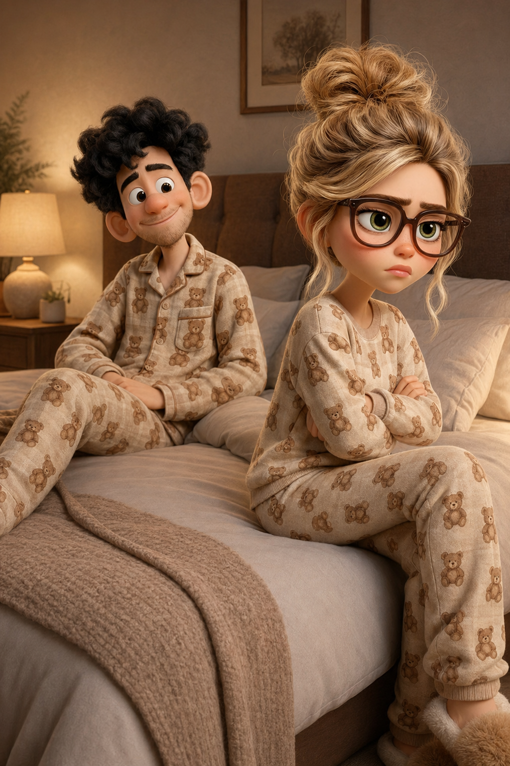 Art style: Stylized 3D character art. Женщина ложится на кровать рядом с мужчиной, демонстративно отворачиваясь от него к самому краю. Она выглядит обиженной и скрестила руки. Мужчина в пижаме с мишками наблюдает за ней с легкой, понимающей улыбкой. Мягкое освещение подчеркивает контуры персонажей. ━━━━━━━━━━━━━━━━━━━━━━━━━━━━━━━━━━━━━━ FINAL STYLE ENFORCEMENT (this is the authoritative rendering directive — it overrides any style wording elsewhere in the prompt): Render this image entirely in "Stylized 3D character art" style. Match the lighting grammar, material response, colour science, level of realism / stylisation, line weight, and shading model typical of "Stylized 3D character art". Keep the subject, composition, camera angle, lighting direction, and colour palette from the description above — but EVERY surface, skin, fabric, material, and environmental element must be rendered in the "Stylized 3D character art" idiom, not in any other medium. Character appearance reference (MUST match exactly): - Мужчина: Молодой мужчина в стиле 3D-анимации с вытянутым лицом, светлой кожей и легкой щетиной на подбородке. У него густые, черные кудрявые волосы, большие выразительные карие глаза и заметно крупные уши. Он широко и дружелюбно улыбается, обнажая зубы. Мужчина худощавого телосложения одет в бежевую клетчатую пижаму с принтом в виде маленьких плюшевых мишек и пушистые коричневые тапочки. Он стоит в полный рост, приветливо машет правой рукой, в то время как левая рука расслаблена. - Женщина: Sorry, Gemini API returned an empty response. Please try with a different AI model.