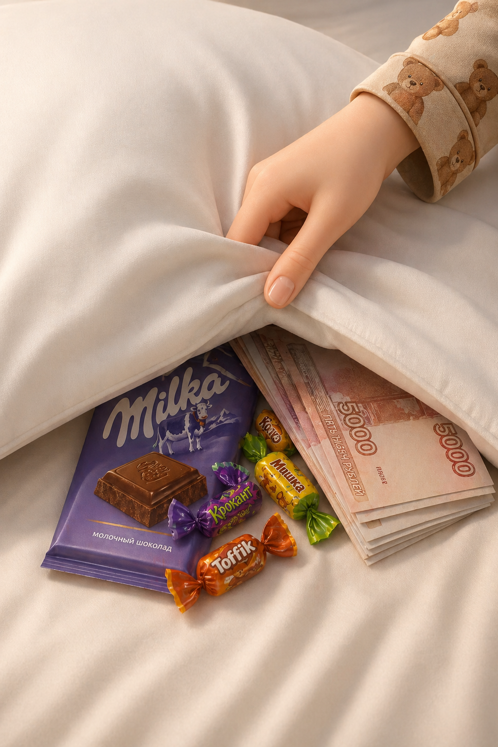 Art style: Stylized 3D character art. Крупный план женской руки, которая аккуратно вытягивает из-под белой подушки шоколадный батончик, несколько конфет в ярких обертках и пачку денежных купюр. Предметы лежат на светлой простыне рядом с краем подушки. Акцент сделан на деталях подарков и текстуре ткани. ━━━━━━━━━━━━━━━━━━━━━━━━━━━━━━━━━━━━━━ FINAL STYLE ENFORCEMENT (this is the authoritative rendering directive — it overrides any style wording elsewhere in the prompt): Render this image entirely in "Stylized 3D character art" style. Match the lighting grammar, material response, colour science, level of realism / stylisation, line weight, and shading model typical of "Stylized 3D character art". Keep the subject, composition, camera angle, lighting direction, and colour palette from the description above — but EVERY surface, skin, fabric, material, and environmental element must be rendered in the "Stylized 3D character art" idiom, not in any other medium. Character appearance reference (MUST match exactly): - Мужчина: Молодой мужчина в стиле 3D-анимации с вытянутым лицом, светлой кожей и легкой щетиной на подбородке. У него густые, черные кудрявые волосы, большие выразительные карие глаза и заметно крупные уши. Он широко и дружелюбно улыбается, обнажая зубы. Мужчина худощавого телосложения одет в бежевую клетчатую пижаму с принтом в виде маленьких плюшевых мишек и пушистые коричневые тапочки. Он стоит в полный рост, приветливо машет правой рукой, в то время как левая рука расслаблена.