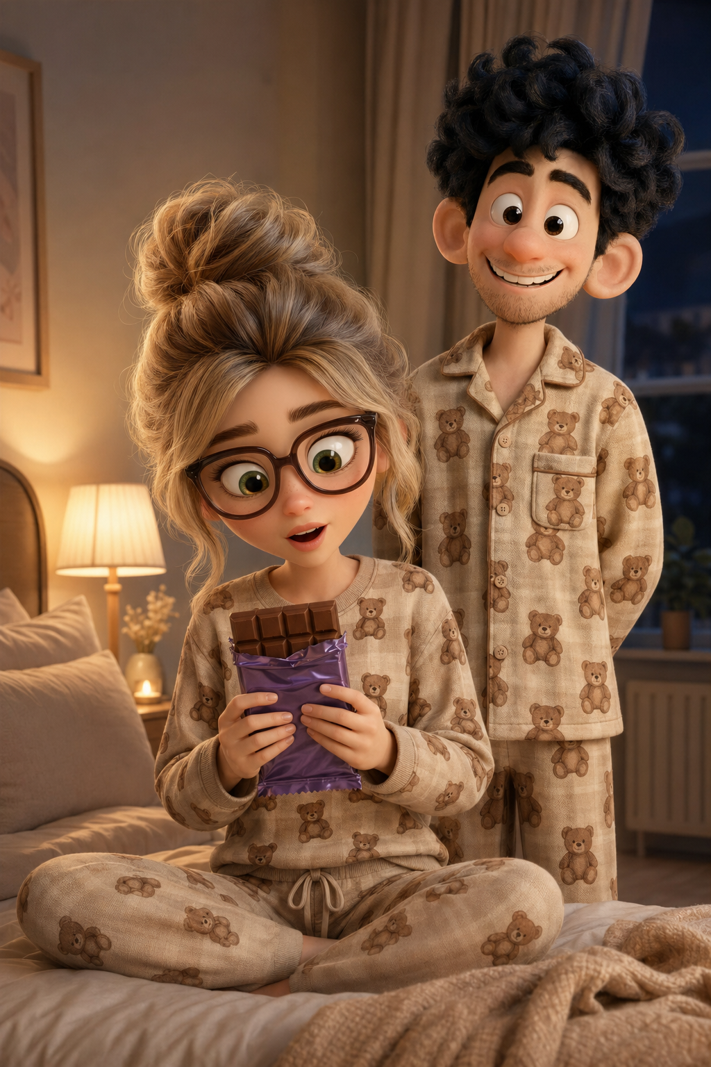 Art style: Stylized 3D character art. Женщина сидит на кровати в пижаме, держа в руках шоколадку Milka. Мужчина за ее спиной довольно улыбается, глядя на ее реакцию. Теплый свет лампы создает атмосферу нежности и примирения. ━━━━━━━━━━━━━━━━━━━━━━━━━━━━━━━━━━━━━━ FINAL STYLE ENFORCEMENT (this is the authoritative rendering directive — it overrides any style wording elsewhere in the prompt): Render this image entirely in "Stylized 3D character art" style. Match the lighting grammar, material response, colour science, level of realism / stylisation, line weight, and shading model typical of "Stylized 3D character art". Keep the subject, composition, camera angle, lighting direction, and colour palette from the description above — but EVERY surface, skin, fabric, material, and environmental element must be rendered in the "Stylized 3D character art" idiom, not in any other medium. Character appearance reference (MUST match exactly): - Мужчина: Молодой мужчина в стиле 3D-анимации с вытянутым лицом, светлой кожей и легкой щетиной на подбородке. У него густые, черные кудрявые волосы, большие выразительные карие глаза и заметно крупные уши. Он широко и дружелюбно улыбается, обнажая зубы. Мужчина худощавого телосложения одет в бежевую клетчатую пижаму с принтом в виде маленьких плюшевых мишек и пушистые коричневые тапочки. Он стоит в полный рост, приветливо машет правой рукой, в то время как левая рука расслаблена. - Женщина: Sorry, Gemini API returned an empty response. Please try with a different AI model.