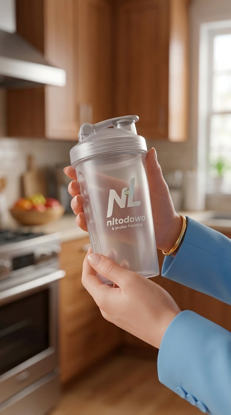 Art style: 3D Pixar. Вертикальный кадр. Крупный план на руках Ирины, она держит стильный брендированный шейкер NL. На заднем плане размытая кухня. Фокус на продукте. Стиль - 3D-анимация Pixar. ━━━━━━━━━━━━━━━━━━━━━━━━━━━━━━━━━━━━━━ FINAL STYLE ENFORCEMENT (this is the authoritative rendering directive — it overrides any style wording elsewhere in the prompt): Render this image entirely in "3D Pixar" style. Match the lighting grammar, material response, colour science, level of realism / stylisation, line weight, and shading model typical of "3D Pixar". Keep the subject, composition, camera angle, lighting direction, and colour palette from the description above — but EVERY surface, skin, fabric, material, and environmental element must be rendered in the "3D Pixar" idiom, not in any other medium. Character appearance reference (MUST match exactly): - Ирина: Женщина средних лет со светлой кожей и стройным телосложением, внешне напоминающая Лиз Трасс. У нее светлые волосы цвета блонд, уложенные в аккуратное каре до подбородка с боковым пробором. Лицо овальной формы с выраженными скулами, глаза серо-голубые, взгляд прямой и серьезный. Она одета в элегантный небесно-голубой брючный костюм, состоящий из приталенного пиджака и прямых брюк, под которым виден белый шелковый топ. На шее тонкая золотая цепочка с сине-желтой подвеской. Поза уверенная: одна рука на бедре, другая касается волос у затылка. Стилистика изображения напоминает детализированную 3D-анимацию.