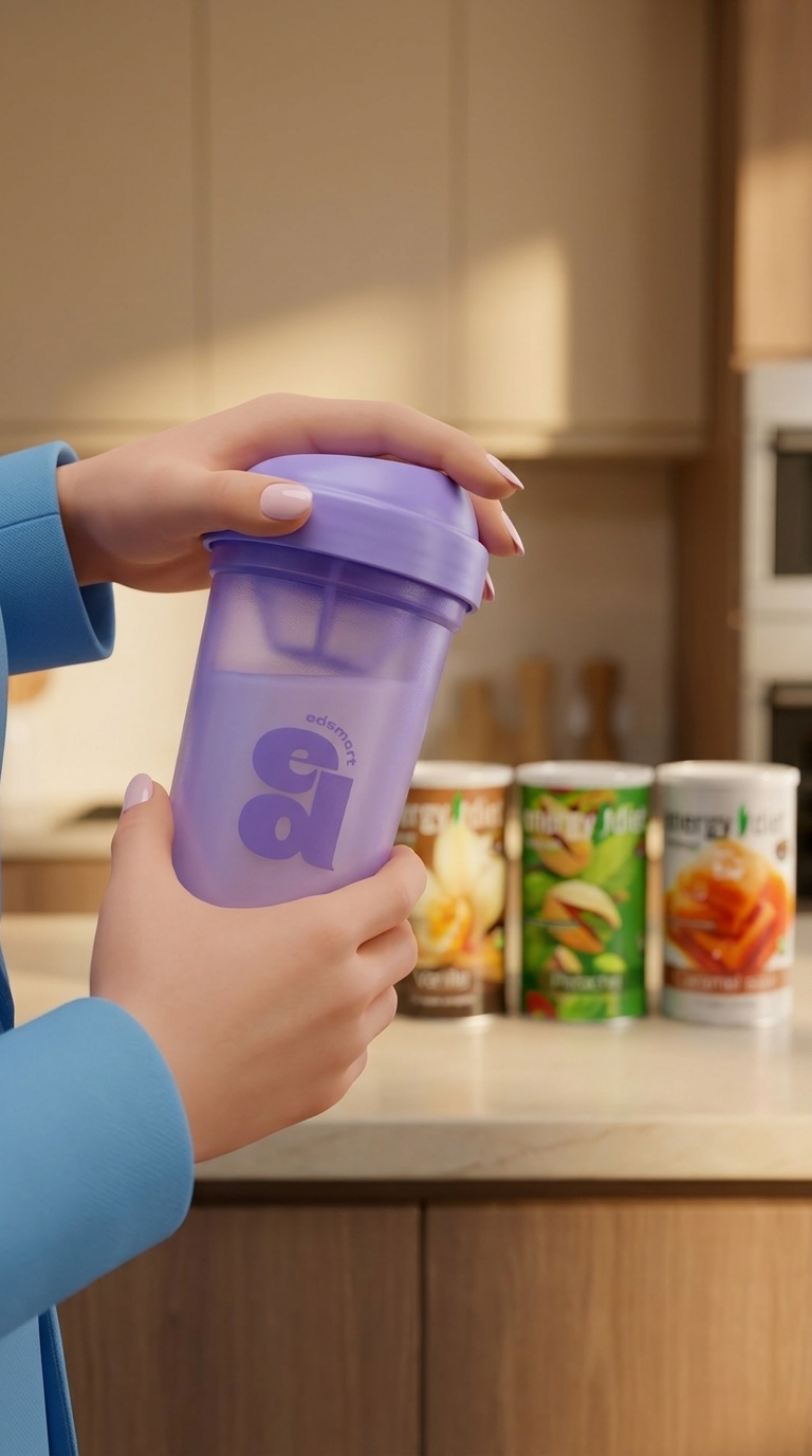 Art style: 3D Pixar. Вертикальный кадр. Крупный план на руках Ирины, она держит стильный брендированный шейкер сиреневый. На заднем плане размытая кухня. Фокус на продукте. На столешнице в ряд стоят три баночки коктейля, размыттые но узнаваемые. Стиль - 3D-анимация Pixar. ━━━━━━━━━━━━━━━━━━━━━━━━━━━━━━━━━━━━━━ FINAL STYLE ENFORCEMENT (this is the authoritative rendering directive — it overrides any style wording elsewhere in the prompt): Render this image entirely in "3D Pixar" style. Match the lighting grammar, material response, colour science, level of realism / stylisation, line weight, and shading model typical of "3D Pixar". Keep the subject, composition, camera angle, lighting direction, and colour palette from the description above — but EVERY surface, skin, fabric, material, and environmental element must be rendered in the "3D Pixar" idiom, not in any other medium. Character appearance reference (MUST match exactly): - Ирина: Женщина средних лет со светлой кожей и стройным телосложением, внешне напоминающая Лиз Трасс. У нее светлые волосы цвета блонд, уложенные в аккуратное каре до подбородка с боковым пробором. Лицо овальной формы с выраженными скулами, глаза серо-голубые, взгляд прямой и серьезный. Она одета в элегантный небесно-голубой брючный костюм, состоящий из приталенного пиджака и прямых брюк, под которым виден белый шелковый топ. На шее тонкая золотая цепочка с сине-желтой подвеской. Поза уверенная: одна рука на бедре, другая касается волос у затылка. Стилистика изображения напоминает детализированную 3D-анимацию. Reference images context (match the visual style and elements from these): - Фиолетовый шейкер Edsmart (prop): Прозрачный фиолетовый стакан-шейкер с плотной крышкой и логотипом «edsmart» по центру. Предмет выполнен в минималистичном стиле на чистом белом фоне. - Банка Energy Diet Ваниль (prop): Цилиндрическая банка заменителя питания Energy Diet со вкусом ванили, украшенная крупным изображением цветка ванили на коричневом фоне. На упаковке видны логотипы бренда Beautysané и информационные надписи на французском и русском языках. - Банка Energy Diet со вкусом фисташки (prop): Цилиндрическая упаковка диетического питания Energy Diet с изображением фисташек на ярко-зеленом фоне. На этикетке указана информация о составе на русском и французском языках. - Банка Energy Diet Соленая карамель (prop): Белая цилиндрическая банка диетического питания Energy Diet со вкусом соленой карамели, украшенная изображением аппетитных кубиков карамели с кристаллами соли. На упаковке видны логотипы бренда, надписи на французском и русском языках, а также информация о содержании витаминов.