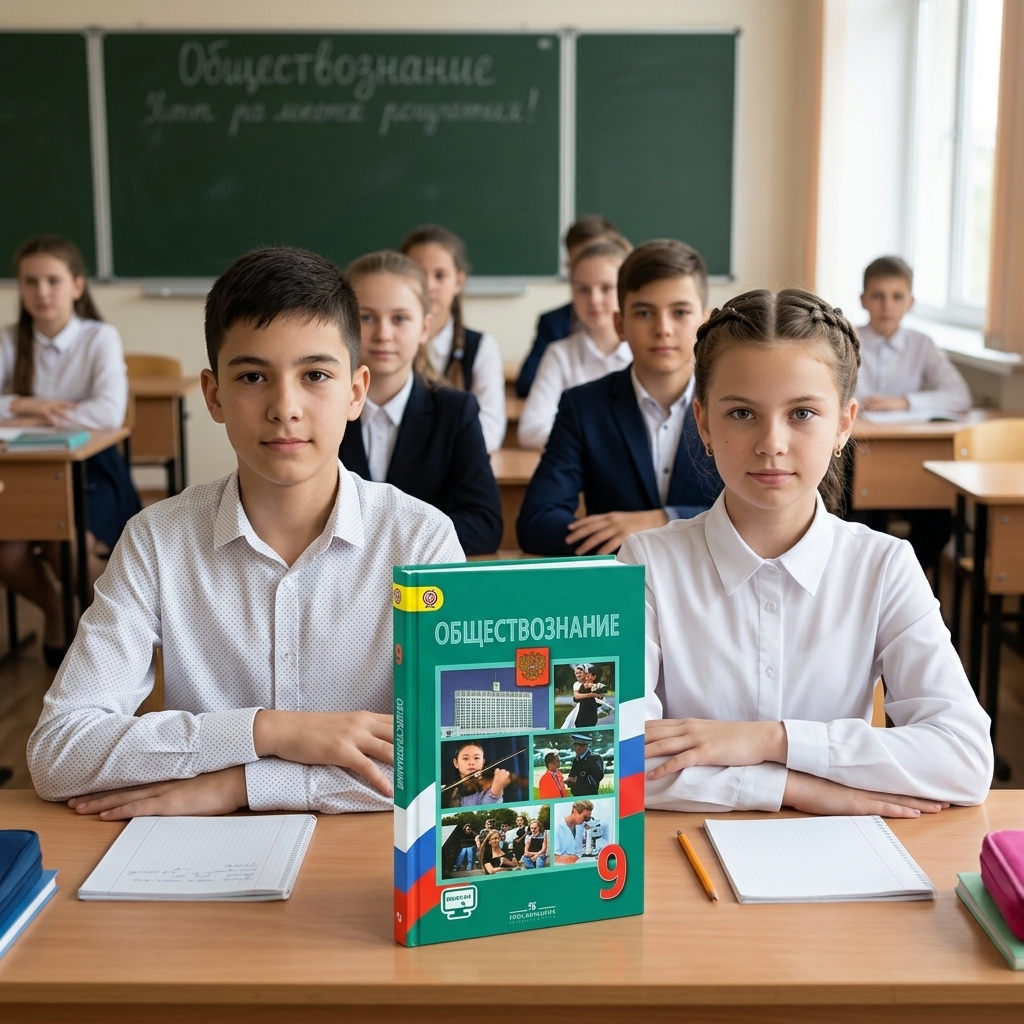 создай гиперралистичное изображение. на фото сидят школьники на уроке за партой примерно как на 2 фото референсе но измени внешность детей. на столе стоит учебник по обществознанию. в точности как на фото референсе 1. без изменений с сохранением всех надписей. сходство учебника 1:1. учебник сделай соразмерным парте и объектам на изображении. фото как при проф съемке. учебник стоит сбоку и чуть меньше по размеры