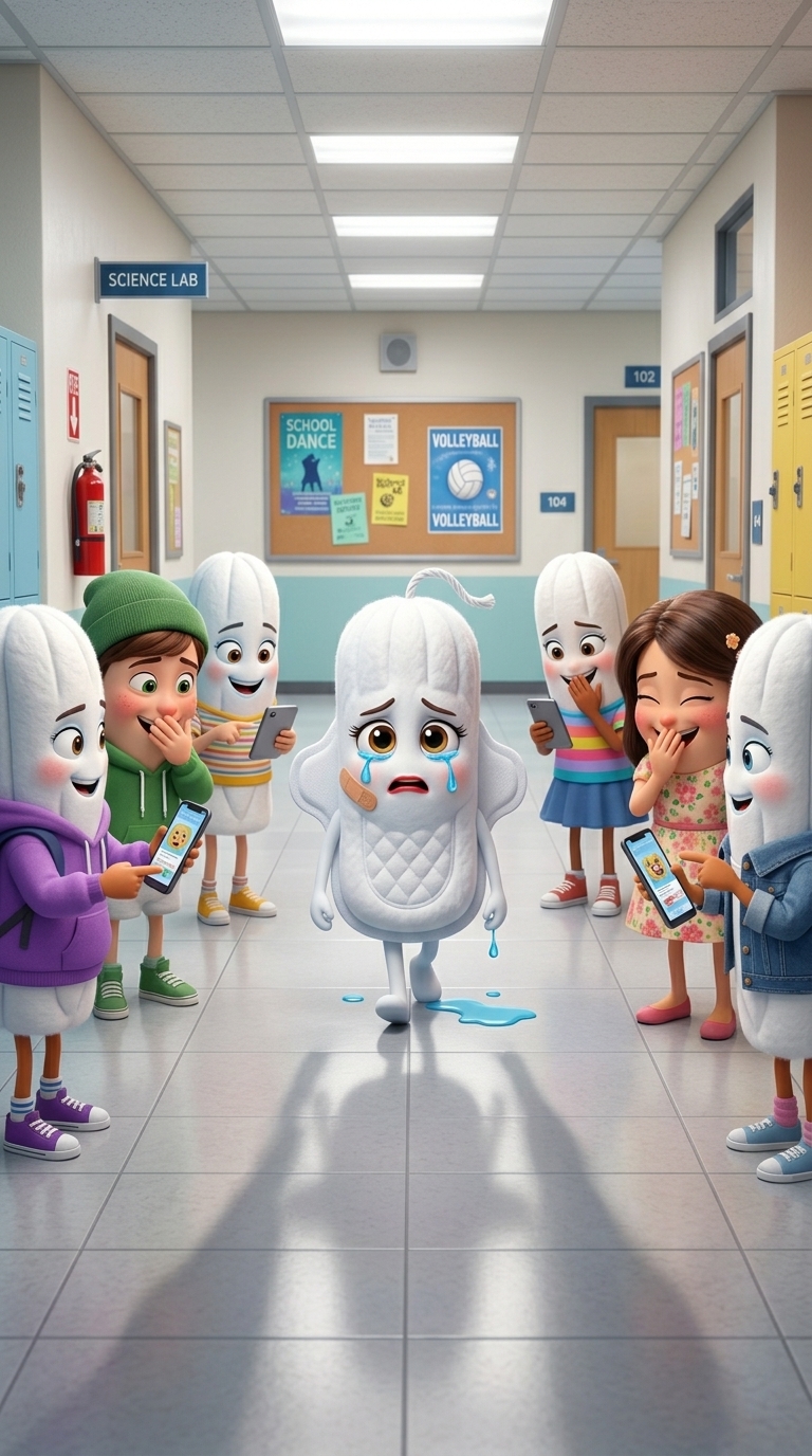 Art style: 3D Pixar-style animation. A wide shot of a school corridor. The daughter pad walks down the center, crying blue tears. On both sides, groups of tampon students are pointing at their phones and laughing at her. The atmosphere is one of public humiliation and isolation. The lighting is bright but feels cold. ━━━━━━━━━━━━━━━━━━━━━━━━━━━━━━━━━━━━━━ FINAL STYLE ENFORCEMENT (this is the authoritative rendering directive — it overrides any style wording elsewhere in the prompt): Render this image entirely in "3D Pixar-style animation" style. Match the lighting grammar, material response, colour science, level of realism / stylisation, line weight, and shading model typical of "3D Pixar-style animation". Keep the subject, composition, camera angle, lighting direction, and colour palette from the description above — but EVERY surface, skin, fabric, material, and environmental element must be rendered in the "3D Pixar-style animation" idiom, not in any other medium. Character appearance reference (MUST match exactly): - Background Tampons: Strong rule: style --- 3D Pixar-style animation ---. A diverse group of anthropomorphic tampon characters in a school hallway. Some wear colorful dresses, others wear hoodies or casual clothes. They all have cylindrical bodies and expressive faces, appearing to gossip and laugh. The environment is a brightly lit, modern school corridor. - Тампокладка: Sorry, Gemini API returned an empty response. Please try with a different AI model.