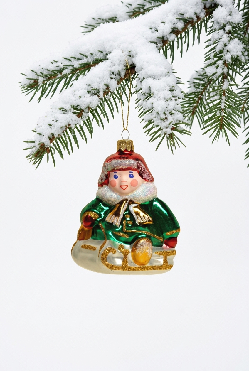 создай гиперреалистичное фото. пушистая елочная ветвь свисает на ней лежит снег. на ветке висит елочка игрушка в точности как на фото референсе. сходство 1:1. изображение на ровном белом фоне без теней