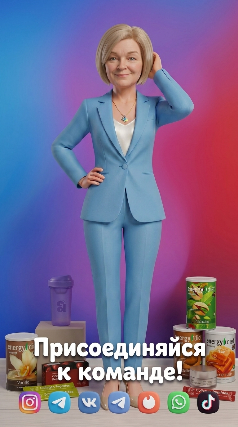Art style: 3D Pixar. Вертикальный кадр. Ирина в том же деловом костюме стоит на фоне стильного градиента в цветах бренда NL. Она смотрит прямо в камеру с приглашающей улыбкой. Внизу появляется анимированный текст: 'Присоединяйся к команде!' и иконки соцсетей. ━━━━━━━━━━━━━━━━━━━━━━━━━━━━━━━━━━━━━━ FINAL STYLE ENFORCEMENT (this is the authoritative rendering directive — it overrides any style wording elsewhere in the prompt): Render this image entirely in "3D Pixar" style. Match the lighting grammar, material response, colour science, level of realism / stylisation, line weight, and shading model typical of "3D Pixar". Keep the subject, composition, camera angle, lighting direction, and colour palette from the description above — but EVERY surface, skin, fabric, material, and environmental element must be rendered in the "3D Pixar" idiom, not in any other medium. Character appearance reference (MUST match exactly): - Ирина: Женщина средних лет со светлой кожей и стройным телосложением, внешне напоминающая Лиз Трасс. У нее светлые волосы цвета блонд, уложенные в аккуратное каре до подбородка с боковым пробором. Лицо овальной формы с выраженными скулами, глаза серо-голубые, взгляд прямой и серьезный. Она одета в элегантный небесно-голубой брючный костюм, состоящий из приталенного пиджака и прямых брюк, под которым виден белый шелковый топ. На шее тонкая золотая цепочка с сине-желтой подвеской. Поза уверенная: одна рука на бедре, другая касается волос у затылка. Стилистика изображения напоминает детализированную 3D-анимацию. Reference images context (match the visual style and elements from these): - Фиолетовый шейкер Edsmart (prop): Прозрачный фиолетовый стакан-шейкер с плотной крышкой и логотипом «edsmart» по центру. Предмет выполнен в минималистичном стиле на чистом белом фоне. - Банка Energy Diet Ваниль (prop): Цилиндрическая банка заменителя питания Energy Diet со вкусом ванили, украшенная крупным изображением цветка ванили на коричневом фоне. На упаковке видны логотипы бренда Beautysané и информационные надписи на французском и русском языках. - Банка Energy Diet со вкусом фисташки (prop): Цилиндрическая упаковка диетического питания Energy Diet с изображением фисташек на ярко-зеленом фоне. На этикетке указана информация о составе на русском и французском языках. - Банка Energy Diet Соленая карамель (prop): Белая цилиндрическая банка диетического питания Energy Diet со вкусом соленой карамели, украшенная изображением аппетитных кубиков карамели с кристаллами соли. На упаковке видны логотипы бренда, надписи на французском и русском языках, а также информация о содержании витаминов. - Крем для лица Biome 2 в 1 (prop): Баночка и коробка косметического крема, расположенные на фоне ветки розовых орхидей и мягкого зеленого градиента. Композиция в стиле рекламной фотографии подчеркивает премиальность и натуральный состав продукта. - Детские витамины PROHELPER (prop): Ярко-красная упаковка и оранжевый флакон детских витаминов PROHELPER с изображением белого кролика-жонглера. На этикетке указано содержание 11 витаминов и 3 минералов, а также общее количество — 60 таблеток. - Коллагеновые пептиды с вишней (prop): Красная упаковка и порционные стики коллагена, окруженные парящими ягодами вишни на насыщенном красном фоне. Изображение представляет собой стильную рекламную композицию с акцентом на монохромную палитру и динамику. - Коллагеновые пептиды Greenflash (prop): Упаковка и отдельные стики коллагеновых пептидов Greenflash оливкового цвета на фоне белых цветов и светлой поверхности. Изображение передает атмосферу здоровья и красоты, акцентируя внимание на деталях продукта и его составе.
