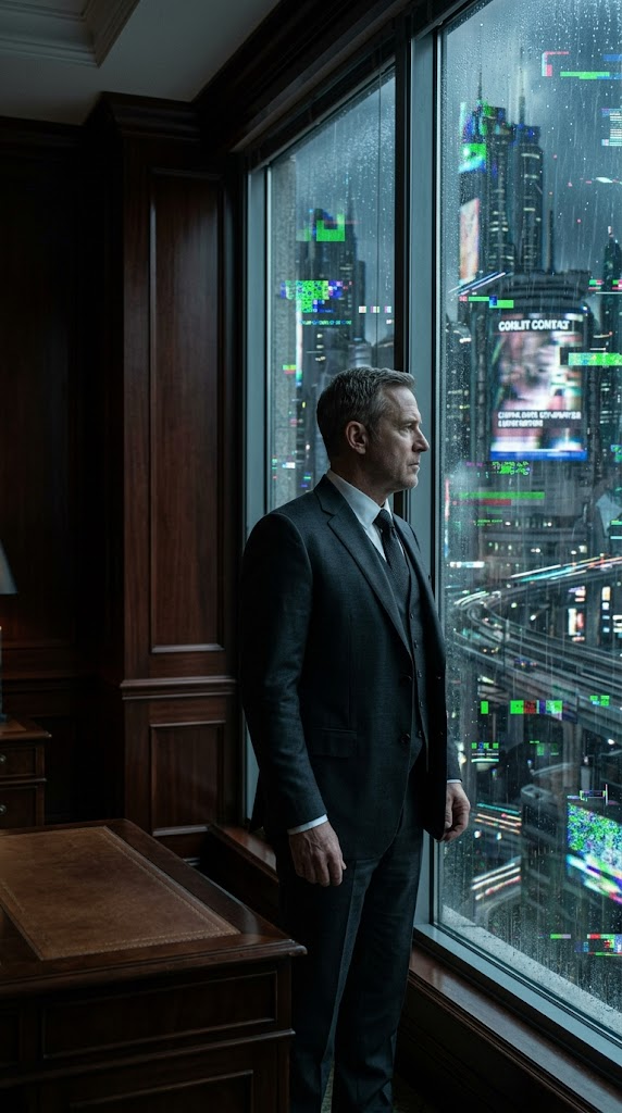 Art style: Cinematic Realism, photorealistic, 8k, shot on .... Кинематографический крупный план стоического чиновника в темном, обшитом красным деревом кабинете, смотрящего в дождливое окно на футуристический городской пейзаж, который мерцает и дает сбои с цифровыми артефактами. ━━━━━━━━━━━━━━━━━━━━━━━━━━━━━━━━━━━━━━ FINAL STYLE ENFORCEMENT (this is the authoritative rendering directive — it overrides any style wording elsewhere in the prompt): Render this image entirely in "Cinematic Realism, photorealistic, 8k, shot on ..." style. Match the lighting grammar, material response, colour science, level of realism / stylisation, line weight, and shading model typical of "Cinematic Realism, photorealistic, 8k, shot on ...". Keep the subject, composition, camera angle, lighting direction, and colour palette from the description above — but EVERY surface, skin, fabric, material, and environmental element must be rendered in the "Cinematic Realism, photorealistic, 8k, shot on ..." idiom, not in any other medium.