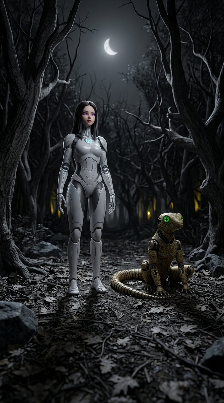 Strong rule: style --- 3D Pixar ---. Пышный лесной луг с высокими травами, полевыми цветами и ручьём, повсюду порхают бабочки, древние дубы с дуплами. Крупный план с динамичным углом сверху вниз. Тёплое послеполуденное солнце, фильтрующееся сквозь кроны, создающее пятна света и тени. Атмосфера игривости и гармонии. Разнообразные сказочные животные — фениксы, грифоны — резвятся, Арина смеётся, Нейрон прыгает. Яркие зелёные тона с оранжевыми и фиолетовыми всплесками. Character appearance reference (MUST match exactly): - Арина: Молодая женщина около 25-30 лет в стиле 3D-анимации с овальным лицом и светлой кожей. У нее длинные волнистые светлые волосы, уложенные набок, и большие выразительные голубые глаза. Она стройного телосложения, одета в приталенный бордовый пиджак поверх белой футболки и черные облегающие брюки с высокой талией. На лице уверенная и дружелюбная полуулыбка, она стоит в уверенной позе, положив одну руку на бедро. - Нейрон: Маленький робот-кот, выполненный из матового синего металла с ярко-оранжевыми акцентами. У него округлая голова с большими, светящимися голубыми цифровыми глазами и дружелюбной улыбкой. Вместо ушей — оранжевые вставки, а на макушке расположены две тонкие антенны. Тело компактное, с четко выраженными шарнирными суставами и светящимся оранжевым ядром в центре груди. Лапы оснащены светящимися оранжевыми подушечками, а длинный сегментированный хвост заканчивается ярким огоньком. Робот сидит в непринужденной позе, излучая любопытство и доброжелательность, с выражением искренней радости на мордочке.