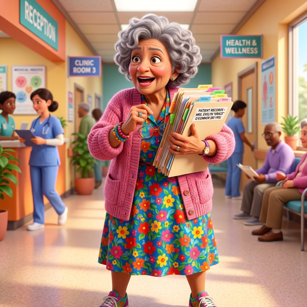 Strong rule: style --- 3D Pixar Animation, bright, colorful, highly ex... ---. 80-year-old woman, energetic, curly grey hair, wearing a bright floral dress and a knitted pink cardigan. Holding a giant medical folder. Expressive and commanding posture. 3D Pixar style.