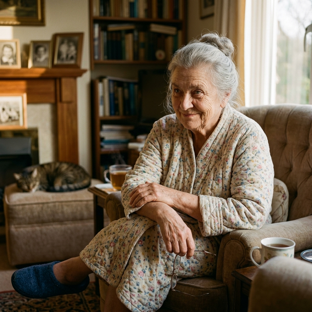 Strong rule: style --- Реалистичная кинематография, теплые цвета, душе... ---. Женщина 80-85 лет, европейской внешности, с седыми волосами, собранными в пучок. У нее живые, хитрые глаза и морщинистое, но доброе лицо. Одета в простой домашний халат с цветочным узором, на ногах тапочки.