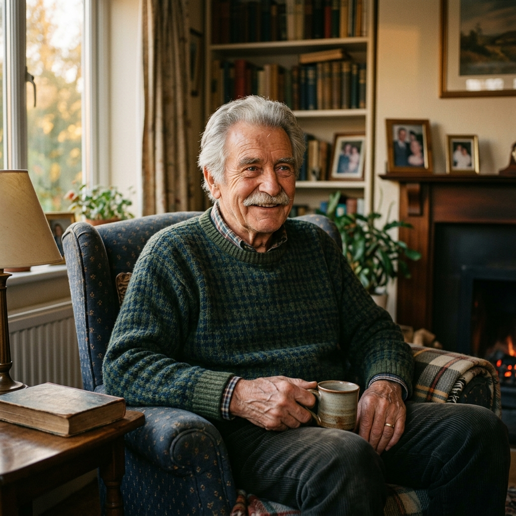 Strong rule: style --- Реалистичная кинематография, теплые цвета, душе... ---. Мужчина 80-85 лет, европейской внешности, седой, с усами. Выглядит немного уставшим, но в глазах пляшут искорки. Одет в старый, но чистый свитер и брюки.