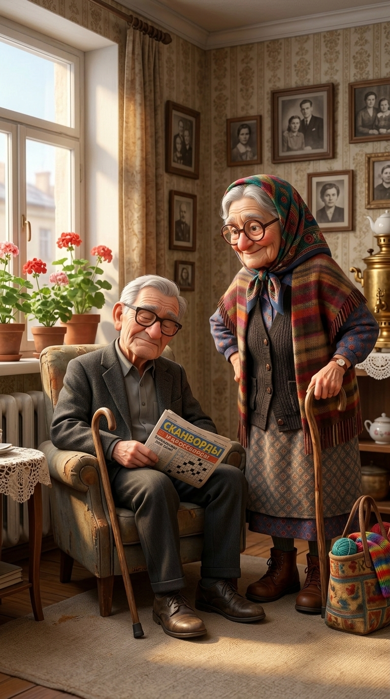 Art style: style --- 3D Pixar анимация. Уютная, немного старомодная гостиная в российской квартире. Утро. Бабка Зинаида, 80-летняя женщина европейской внешности, стоит руки в боки перед Дедом Игнатом, который дремлет в кресле у окна. На стенах старые фотографии, на подоконнике герань. Вертикальная композиция 9:16. ━━━━━━━━━━━━━━━━━━━━━━━━━━━━━━━━━━━━━━ FINAL STYLE ENFORCEMENT (this is the authoritative rendering directive — it overrides any style wording elsewhere in the prompt): Render this image entirely in "style --- 3D Pixar анимация" style. Match the lighting grammar, material response, colour science, level of realism / stylisation, line weight, and shading model typical of "style --- 3D Pixar анимация". Keep the subject, composition, camera angle, lighting direction, and colour palette from the description above — but EVERY surface, skin, fabric, material, and environmental element must be rendered in the "style --- 3D Pixar анимация" idiom, not in any other medium. Character appearance reference (MUST match exactly): - Бабка Зинаида: Пожилая женщина с добрым, морщинистым лицом и большими круглыми очками. У неё светлая кожа и седые волосы, почти полностью скрытые под ярким узорчатым платком. Она невысокого роста, коренастого телосложения. Одета в многослойный наряд: полосатую шаль с бахромой, тёмный вязаный жилет поверх синей блузки с принтом и длинную юбку с геометрическим узором. На ногах — прочные коричневые кожаные ботинки на шнуровке. В одной руке она держит изогнутую деревянную трость, а в другой — гобеленовую сумку, полную разноцветной пряжи и вязальных спиц. Её лицо озарено мягкой, приветливой улыбкой, а взгляд выражает теплоту и жизненную мудрость. - Дед Игнат: Пожилой мужчина с добрым лицом в стиле 3D-анимации, с квадратной челюстью и светлой морщинистой кожей. У него короткие, аккуратно зачесанные седые волосы и темные глаза за массивными очками в толстой черной оправе. Он среднего телосложения, одет в темно-серый фактурный пиджак, серую рубашку на пуговицах, темные брюки и коричневые кожаные туфли. В руках он держит газету со сканвордами и деревянную трость с изогнутой ручкой. Его выражение лица теплое и улыбчивое, поза расслабленная, сидячая, с характерными крупными ушами и выдающимся носом.