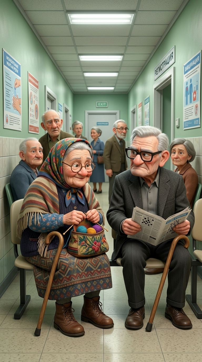 Art style: style --- 3D Pixar анимация. Коридор районной поликлиники. На стенах информационные плакаты, на двери кабинета табличка "РЕГИСТРАТУРА" на русском языке. В очереди сидят несколько пожилых людей европейской внешности. Дед Игнат и Бабка Зинаида сидят на стульях, Игнат смотрит на жену с укором. Освещение типичное для госучреждения - лампы дневного света. Формат 9:16. ━━━━━━━━━━━━━━━━━━━━━━━━━━━━━━━━━━━━━━ FINAL STYLE ENFORCEMENT (this is the authoritative rendering directive — it overrides any style wording elsewhere in the prompt): Render this image entirely in "style --- 3D Pixar анимация" style. Match the lighting grammar, material response, colour science, level of realism / stylisation, line weight, and shading model typical of "style --- 3D Pixar анимация". Keep the subject, composition, camera angle, lighting direction, and colour palette from the description above — but EVERY surface, skin, fabric, material, and environmental element must be rendered in the "style --- 3D Pixar анимация" idiom, not in any other medium. Character appearance reference (MUST match exactly): - Бабка Зинаида: Пожилая женщина с добрым, морщинистым лицом и большими круглыми очками. У неё светлая кожа и седые волосы, почти полностью скрытые под ярким узорчатым платком. Она невысокого роста, коренастого телосложения. Одета в многослойный наряд: полосатую шаль с бахромой, тёмный вязаный жилет поверх синей блузки с принтом и длинную юбку с геометрическим узором. На ногах — прочные коричневые кожаные ботинки на шнуровке. В одной руке она держит изогнутую деревянную трость, а в другой — гобеленовую сумку, полную разноцветной пряжи и вязальных спиц. Её лицо озарено мягкой, приветливой улыбкой, а взгляд выражает теплоту и жизненную мудрость. - Дед Игнат: Пожилой мужчина с добрым лицом в стиле 3D-анимации, с квадратной челюстью и светлой морщинистой кожей. У него короткие, аккуратно зачесанные седые волосы и темные глаза за массивными очками в толстой черной оправе. Он среднего телосложения, одет в темно-серый фактурный пиджак, серую рубашку на пуговицах, темные брюки и коричневые кожаные туфли. В руках он держит газету со сканвордами и деревянную трость с изогнутой ручкой. Его выражение лица теплое и улыбчивое, поза расслабленная, сидячая, с характерными крупными ушами и выдающимся носом.