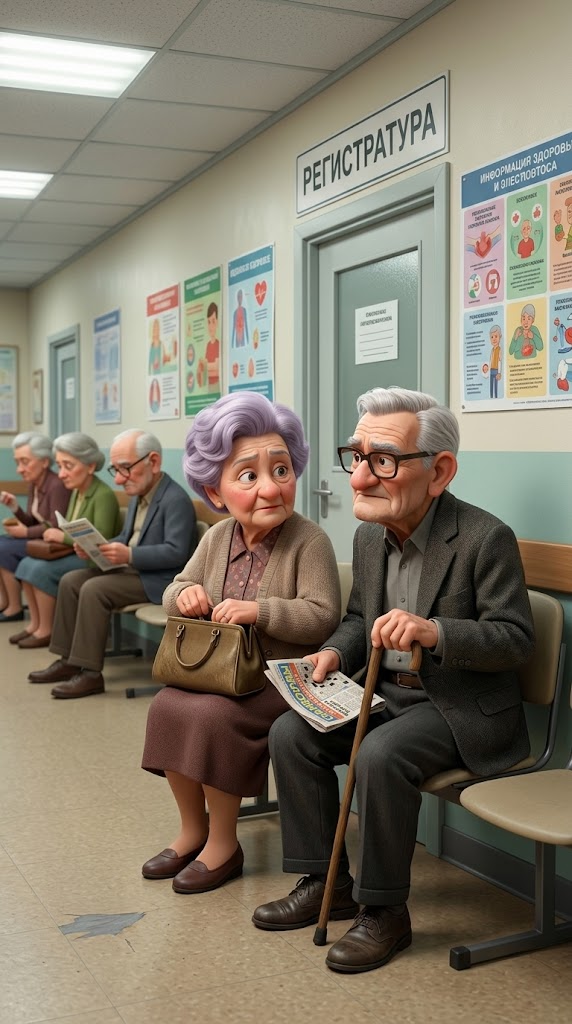 Art style: style --- 3D Pixar анимация. Коридор районной поликлиники. На стенах информационные плакаты, на двери кабинета табличка "РЕГИСТРАТУРА" на русском языке. В очереди сидят несколько пожилых людей европейской внешности. Дед Игнат и Бабка Зинаида сидят на стульях, Игнат смотрит на жену с укором. Освещение типичное для госучреждения - лампы дневного света. Формат 9:16. ━━━━━━━━━━━━━━━━━━━━━━━━━━━━━━━━━━━━━━ FINAL STYLE ENFORCEMENT (this is the authoritative rendering directive — it overrides any style wording elsewhere in the prompt): Render this image entirely in "style --- 3D Pixar анимация" style. Match the lighting grammar, material response, colour science, level of realism / stylisation, line weight, and shading model typical of "style --- 3D Pixar анимация". Keep the subject, composition, camera angle, lighting direction, and colour palette from the description above — but EVERY surface, skin, fabric, material, and environmental element must be rendered in the "style --- 3D Pixar анимация" idiom, not in any other medium.