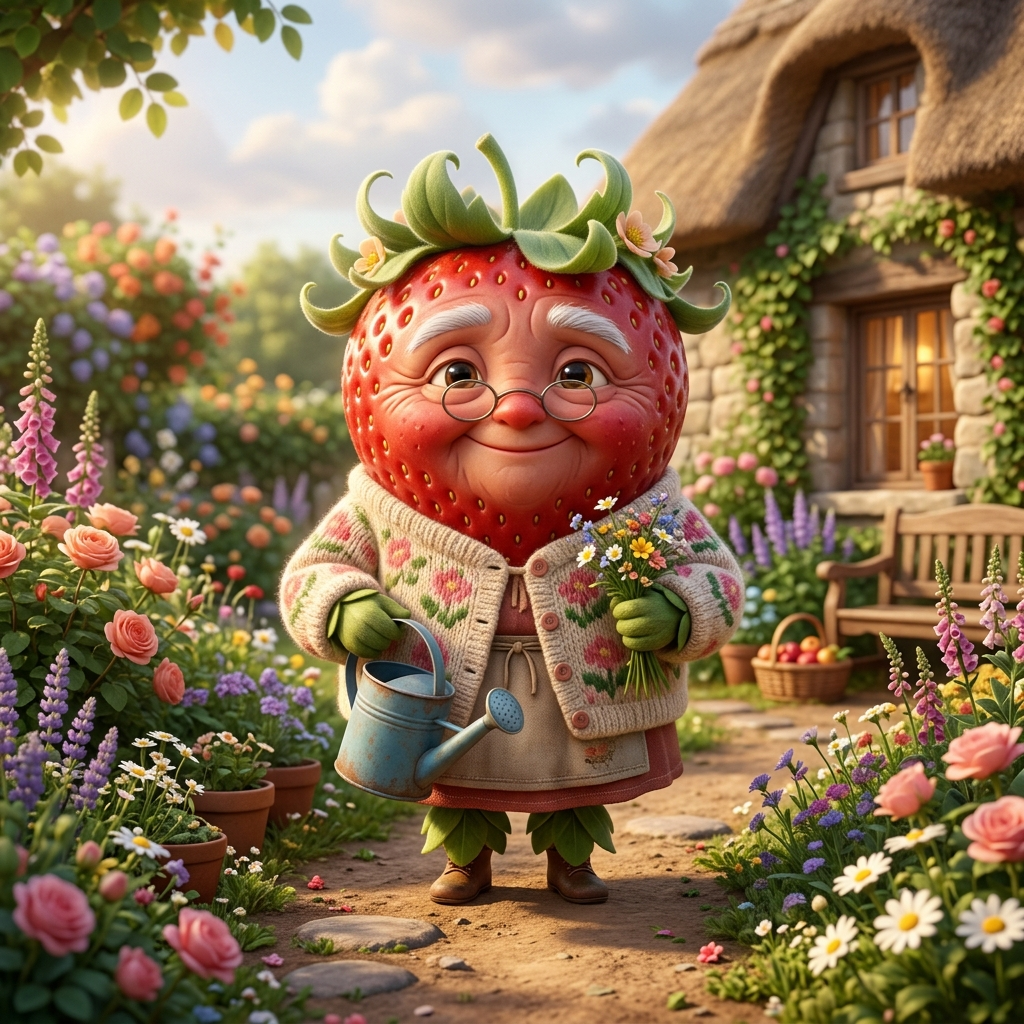 Strong rule: style --- 3D Pixar cinematic ---. An old, caring, anthropomorphic strawberry character. She has a warm, loving face. 3D Pixar style.