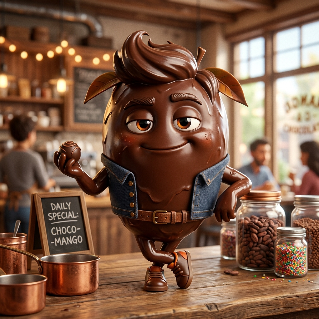 Strong rule: style --- 3D Pixar cinematic ---. A cool, confident, anthropomorphic mango boy character. He is fully coated in elegant dark chocolate. 3D Pixar style.