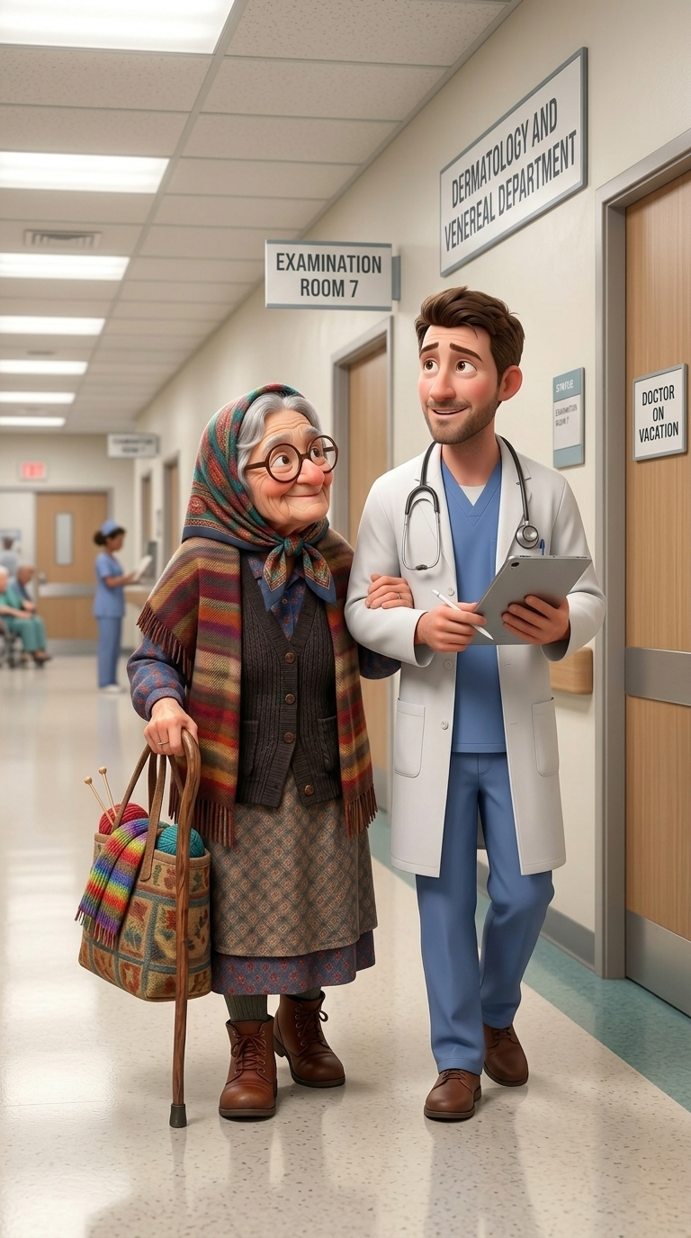 Art style: 3D Pixar анимация. Сцена в светлом, современном больничном коридоре. Молодой врач и пожилая бабушка идут под руку. Бабушка смотрит на врача, а врач смотрит вверх на вывески. На стенах висят указатели: "КАБИНЕТ ОСМОТРА 7", "КОЖНО-ВЕНЕРОЛОГИЧЕСКОЕ ОТДЕЛЕНИЕ", "ВРАЧ В ОТПУСКЕ". Стиль - 3D-анимация Pixar. ━━━━━━━━━━━━━━━━━━━━━━━━━━━━━━━━━━━━━━ FINAL STYLE ENFORCEMENT (this is the authoritative rendering directive — it overrides any style wording elsewhere in the prompt): Render this image entirely in "3D Pixar анимация" style. Match the lighting grammar, material response, colour science, level of realism / stylisation, line weight, and shading model typical of "3D Pixar анимация". Keep the subject, composition, camera angle, lighting direction, and colour palette from the description above — but EVERY surface, skin, fabric, material, and environmental element must be rendered in the "3D Pixar анимация" idiom, not in any other medium. Character appearance reference (MUST match exactly): - Бабушка: Пожилая женщина лет восьмидесяти с добрым, морщинистым лицом и светлой кожей. У неё большие карие глаза, светящиеся мудростью за круглыми очками в толстой оправе, и мягкая, приветливая улыбка. Волосы седые, аккуратно убраны под узорчатый платок. Телосложение невысокое, слегка сутулое. Она одета в многослойный наряд: полосатую разноцветную шаль с бахромой поверх тёмного жилета, синюю блузу с мелким принтом и длинную юбку с орнаментом. На ногах — прочные коричневые кожаные ботинки на шнуровке. В одной руке она держит изогнутую деревянную трость, а в другой — большую гобеленовую сумку, из которой выглядывают клубки яркой пряжи и вязальные спицы. Поза выражает спокойную уверенную походку. - Молодой Врач: Мужчина средних лет, примерно 35-40 лет, с добрым и слегка усталым выражением лица в стиле современной 3D-анимации. У него овальное лицо, светлая кожа и короткие каштановые волосы, небрежно уложенные вверх. Глаза карие, большие и выразительные, с мягким взглядом и легкими морщинками в уголках. На лице видна аккуратная короткая щетина. Телосложение среднее, подтянутое. Персонаж одет в белый медицинский халат поверх голубого хирургического костюма с V-образным вырезом. На шее висит профессиональный стетоскоп. Он стоит вполоборота, держа в руках тонкий планшет и стилус, с легкой, сочувствующей улыбкой на губах.