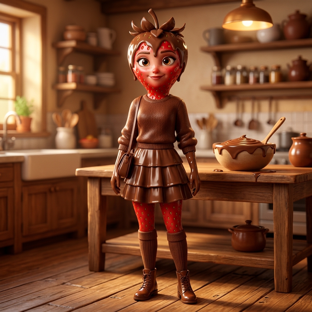 Strong rule: style --- 3D Pixar cinematic ---. Strong rule: style — 3D Pixar cinematic. A full-height anthropomorphic strawberry woman, human-sized body proportions (same height and proportions as a normal human adult woman). Her entire body, head and skin are covered in glossy melted chocolate. The strawberry texture with small seeds is visible under the chocolate glaze. She has a strawberry-shaped head with chocolate strawberry leaves on top. Big expressive Pixar-style eyes, elegant face. She is wearing clothes made of chocolate: a chocolate sweater, chocolate skirt, chocolate socks and chocolate shoes, and a small chocolate shoulder bag. Body proportions: tall human proportions, long legs, adult female body. Pose: standing naturally like a human. Environment: cozy warm kitchen with wooden table and bowl of melted chocolate. Camera: full body shot, human height perspective. Ultra detailed, cinematic lighting, 3D Pixar animation style, glossy chocolate texture. human-sized character, adult human proportions, full height like a normal person Клубника подносом шоколадная