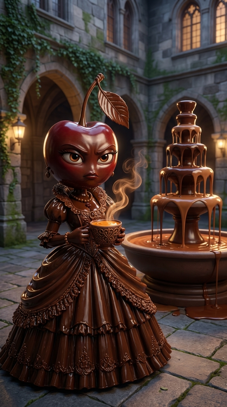Art style: 3D Pixar cinematic. A corner of the campus near a large, flowing chocolate fountain. Ruby stands alone, holding a cup of a hot, steaming caramel drink. Her expression is cold and determined. Soft cinematic lighting, 3D Pixar style. ━━━━━━━━━━━━━━━━━━━━━━━━━━━━━━━━━━━━━━ FINAL STYLE ENFORCEMENT (this is the authoritative rendering directive — it overrides any style wording elsewhere in the prompt): Render this image entirely in "3D Pixar cinematic" style. Match the lighting grammar, material response, colour science, level of realism / stylisation, line weight, and shading model typical of "3D Pixar cinematic". Keep the subject, composition, camera angle, lighting direction, and colour palette from the description above — but EVERY surface, skin, fabric, material, and environmental element must be rendered in the "3D Pixar cinematic" idiom, not in any other medium. Character appearance reference (MUST match exactly): - Ruby: Антропоморфная взрослая женщина в образе знатной дамы, чья голова представляет собой крупную спелую вишню с длинным черенком и резным листком на макушке. Всё тело и одежда имеют текстуру идеально гладкого, глянцевого темного шоколада. У неё выразительные карие глаза с густыми ресницами, тонкие изогнутые брови и уверенная, слегка лукавая улыбка. Она одета в роскошное викторианское бальное платье из шоколада с детальной отделкой кружевом, рюшами и корсетом. Образ дополняют шоколадное ожерелье и изящный веер в руках. Поза величественная и властная, подчеркивающая стройную фигуру и аристократизм.