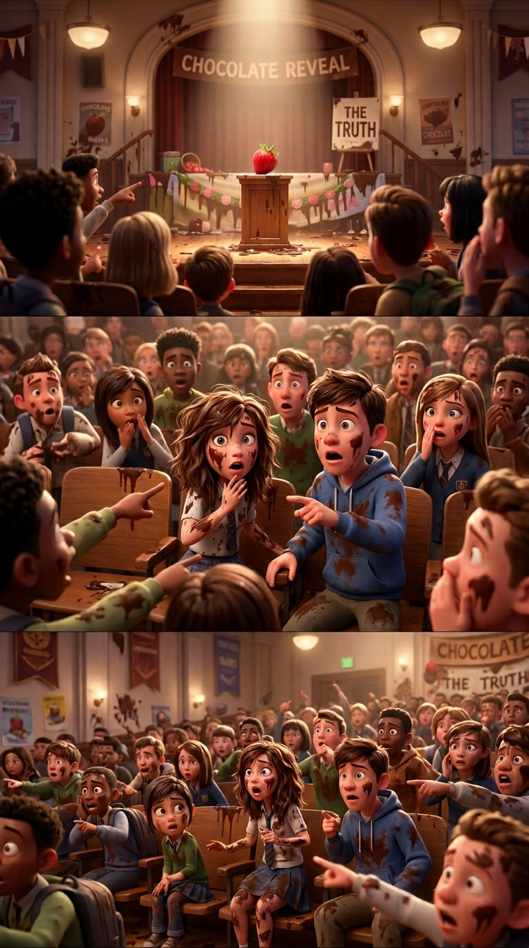 Art style: 3D Pixar cinematic. A wide shot of the shocked crowd of chocolate-covered students. They are all pointing and whispering, looking at the revealed strawberry. Soft cinematic lighting, 3D Pixar style. ━━━━━━━━━━━━━━━━━━━━━━━━━━━━━━━━━━━━━━ FINAL STYLE ENFORCEMENT (this is the authoritative rendering directive — it overrides any style wording elsewhere in the prompt): Render this image entirely in "3D Pixar cinematic" style. Match the lighting grammar, material response, colour science, level of realism / stylisation, line weight, and shading model typical of "3D Pixar cinematic". Keep the subject, composition, camera angle, lighting direction, and colour palette from the description above — but EVERY surface, skin, fabric, material, and environmental element must be rendered in the "3D Pixar cinematic" idiom, not in any other medium.