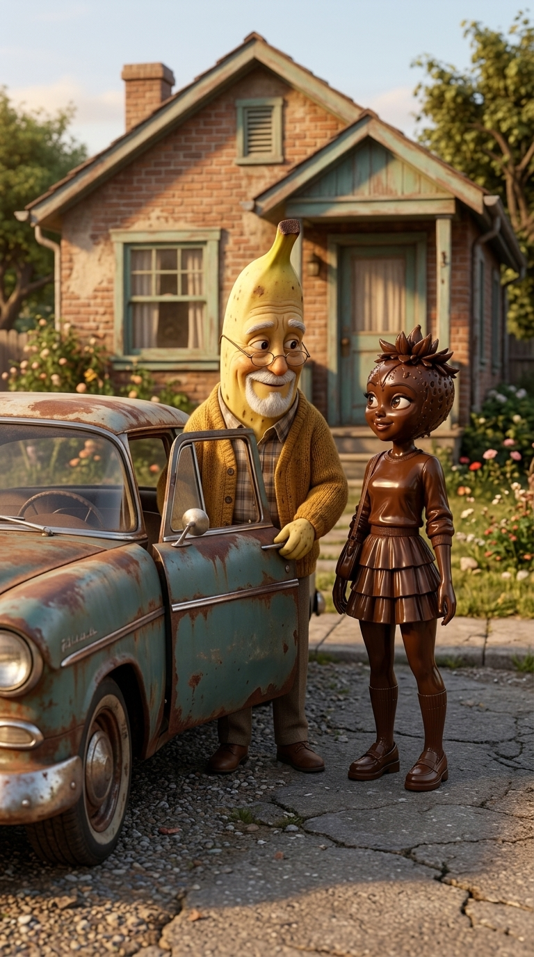 Art style: 3D Pixar cinematic. Exterior of their small, modest house. An old, rusty car is parked outside. Grandpa Banana holds the car door open for Luna. Soft cinematic lighting, 3D Pixar style. ━━━━━━━━━━━━━━━━━━━━━━━━━━━━━━━━━━━━━━ FINAL STYLE ENFORCEMENT (this is the authoritative rendering directive — it overrides any style wording elsewhere in the prompt): Render this image entirely in "3D Pixar cinematic" style. Match the lighting grammar, material response, colour science, level of realism / stylisation, line weight, and shading model typical of "3D Pixar cinematic". Keep the subject, composition, camera angle, lighting direction, and colour palette from the description above — but EVERY surface, skin, fabric, material, and environmental element must be rendered in the "3D Pixar cinematic" idiom, not in any other medium. Character appearance reference (MUST match exactly): - Grandpa Banana: Strong rule: style --- 3D Pixar cinematic ---. An old, anthropomorphic banana character. He has a kind, supportive expression with gentle wrinkles. 3D Pixar style. - Luna: Молодая девушка-подросток, полностью созданная из глянцевого темного шоколада, с округлым кукольным лицом и большими выразительными карими глазами. Ее волосы уложены в причудливую остроконечную корону из шоколадных лепестков, напоминающую плод какао. Она обладает стройным телосложением и одета в облегающий джемпер с длинными рукавами, многослойную плиссированную юбку, гольфы и лоферы — все элементы выполнены из гладкого полированного шоколада. Через плечо перекинута маленькая шоколадная сумочка. На лице играет мягкая, дружелюбная улыбка, поза спокойная и уверенная. Кожа имеет насыщенный коричневый оттенок с зеркальным блеском, подчеркивающим ее необычную кондитерскую природу.