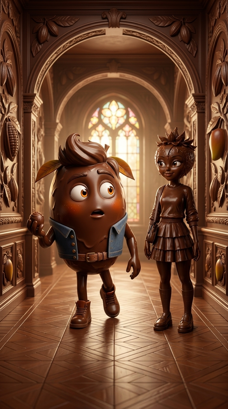 Art style: 3D Pixar cinematic. In the same chocolate hallway, Kai, the mango boy from the poster, walks past Luna. He suddenly stops in his tracks and looks at her, completely amazed. Soft cinematic lighting, 3D Pixar style. ━━━━━━━━━━━━━━━━━━━━━━━━━━━━━━━━━━━━━━ FINAL STYLE ENFORCEMENT (this is the authoritative rendering directive — it overrides any style wording elsewhere in the prompt): Render this image entirely in "3D Pixar cinematic" style. Match the lighting grammar, material response, colour science, level of realism / stylisation, line weight, and shading model typical of "3D Pixar cinematic". Keep the subject, composition, camera angle, lighting direction, and colour palette from the description above — but EVERY surface, skin, fabric, material, and environmental element must be rendered in the "3D Pixar cinematic" idiom, not in any other medium. Character appearance reference (MUST match exactly): - Kai: Strong rule: style --- 3D Pixar cinematic ---. A cool, confident, anthropomorphic mango boy character. He is fully coated in elegant dark chocolate. 3D Pixar style. - Luna: Молодая девушка-подросток, полностью созданная из глянцевого темного шоколада, с округлым кукольным лицом и большими выразительными карими глазами. Ее волосы уложены в причудливую остроконечную корону из шоколадных лепестков, напоминающую плод какао. Она обладает стройным телосложением и одета в облегающий джемпер с длинными рукавами, многослойную плиссированную юбку, гольфы и лоферы — все элементы выполнены из гладкого полированного шоколада. Через плечо перекинута маленькая шоколадная сумочка. На лице играет мягкая, дружелюбная улыбка, поза спокойная и уверенная. Кожа имеет насыщенный коричневый оттенок с зеркальным блеском, подчеркивающим ее необычную кондитерскую природу.