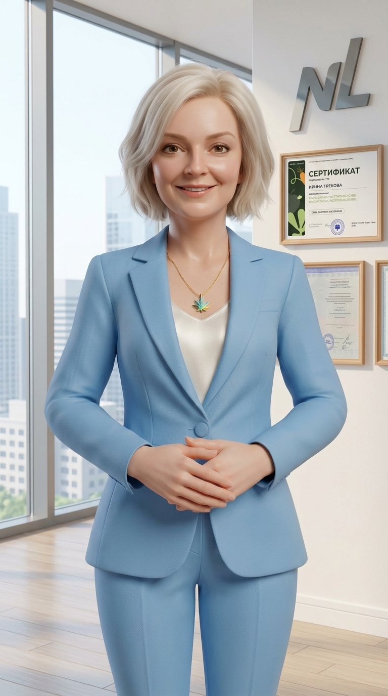 Art style: 3D Pixar. Ирина Грекова стоит в светлом, современном офисе с панорамными окнами. Одета в красивый брючный костюм кобальтово-синего цвета и белую блузку,. Она улыбается прямо в камеру. На стене за ней виден логотип NL и на стене под логотипом несколько дипломов в деревянных тонких рамках. Стиль: 3D Pixar, фотореалистичные текстуры. ━━━━━━━━━━━━━━━━━━━━━━━━━━━━━━━━━━━━━━ FINAL STYLE ENFORCEMENT (this is the authoritative rendering directive — it overrides any style wording elsewhere in the prompt): Render this image entirely in "3D Pixar" style. Match the lighting grammar, material response, colour science, level of realism / stylisation, line weight, and shading model typical of "3D Pixar". Keep the subject, composition, camera angle, lighting direction, and colour palette from the description above — but EVERY surface, skin, fabric, material, and environmental element must be rendered in the "3D Pixar" idiom, not in any other medium. Character appearance reference (MUST match exactly): - Ирина Грекова: Женщина средних лет с благородными чертами лица, светлая кожа, выразительные светло-карие глаза. Волосы платиновый блонд, подстрижены в объемное каре длиной до плеч с мягкими волнами. Стройная фигура, одета в элегантный приталенный брючный костюм небесно-голубого цвета поверх белого атласного топа. На шее тонкая золотая цепочка с детализированным кулоном в виде листа конопли, переливающимся оттенками зеленого и голубого. Спокойное, уверенное выражение лица с едва заметной улыбкой, руки аккуратно сложены перед собой в профессиональной позе. Reference images context (match the visual style and elements from these): - Сертификат нутрициолога (prop): Профессиональный сертификат, выданный Ирине Грековой Ассоциацией нутрициологов и коучей по здоровью. Дизайн включает темно-зеленую боковую панель со стилизованными изображениями овощей и основную белую часть с черным и зеленым текстом, а также синюю печать и подпись. - Диплом о профессиональной переподготовке (prop): Официальный российский документ на гербовой бумаге с синей печатью и подписями, выданный на имя Грековой Ирины Юрьевны по специальности диетолог-консультант. Диплом выполнен в светло-голубых и бежевых тонах с характерными защитными узорами.