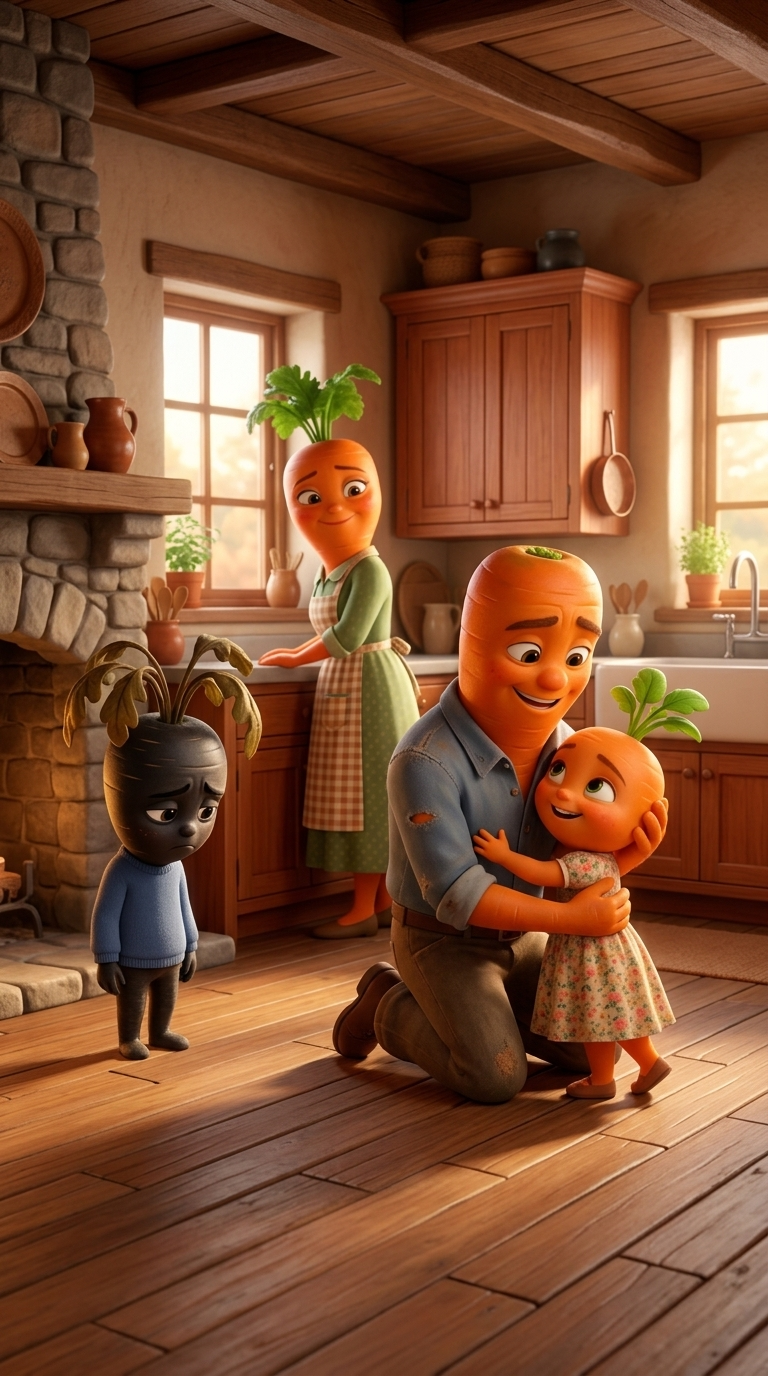Art style: 3D Pixar. Несколько лет спустя. Теплый, уютный, деревенский интерьер дома. Папа Морковка нежно обнимает свою юную оранжевую дочь Софию. Они оба ярко улыбаются. Мама Морковка наблюдает за ними со счастливым выражением лица на заднем плане. Стиль анимации Pixar. а слегка в стороне с опущеной головой стоит чёрная морковь Бен ━━━━━━━━━━━━━━━━━━━━━━━━━━━━━━━━━━━━━━ FINAL STYLE ENFORCEMENT (this is the authoritative rendering directive — it overrides any style wording elsewhere in the prompt): Render this image entirely in "3D Pixar" style. Match the lighting grammar, material response, colour science, level of realism / stylisation, line weight, and shading model typical of "3D Pixar". Keep the subject, composition, camera angle, lighting direction, and colour palette from the description above — but EVERY surface, skin, fabric, material, and environmental element must be rendered in the "3D Pixar" idiom, not in any other medium. Character appearance reference (MUST match exactly): - Papa Carrot: Strong rule: style --- 3D Pixar ---. An adult, tall, anthropomorphic orange carrot man with large, expressive eyes and green leafy hair. He typically wears a simple collared shirt. His expressions range from joyful and loving to shocked, confused, and angry. - Mama Carrot: Strong rule: style --- 3D Pixar ---. An adult, anthropomorphic orange carrot woman with large, kind eyes and lush green leafy hair. She wears a dress or an apron. Her expressions are generally warm, but also show shock and passive worry. - Sofia: Strong rule: style --- 3D Pixar ---. A young, small, cute anthropomorphic orange carrot girl with bright eyes and a happy smile. She has small green leaves for hair and wears cute dresses. - Ben: Strong rule: style --- 3D Pixar ---. A young, small, anthropomorphic black carrot boy with sad, large eyes and slightly wilted green leaves for hair. He wears simple, often plain clothes. His expression is consistently sad, lonely, and longing. Reference images context (match the visual style and elements from these): - Hospital Delivery Room (general): A bright, clean hospital delivery room in 3D Pixar style, featuring a medical bed, heart rate monitors, and soft pastel blue walls, empty of people, soft natural lighting, highly detailed, square format. - Rustic Family Kitchen (general): A cozy, rustic kitchen and dining area in 3D Pixar style, featuring warm wooden cabinets, a farmhouse sink, and earthy tones, empty of people, warm inviting atmosphere, highly detailed, square format. - Wooden Dining Table (general): A sturdy, rustic wooden dining table in 3D Pixar style, made of thick warm-toned planks with visible wood grain, isolated on a clean white background, highly detailed, square format. - Baby Swaddle Blanket (general): A tiny, soft white fabric baby swaddle blanket in 3D Pixar style, delicate knit texture, clean and bright, isolated on a clean white background, highly detailed, square format. - Small Green Backpack (general): A small, simple green canvas backpack for a child in 3D Pixar style, featuring two shoulder straps and a small front pocket, isolated on a clean white background, highly detailed, square format.