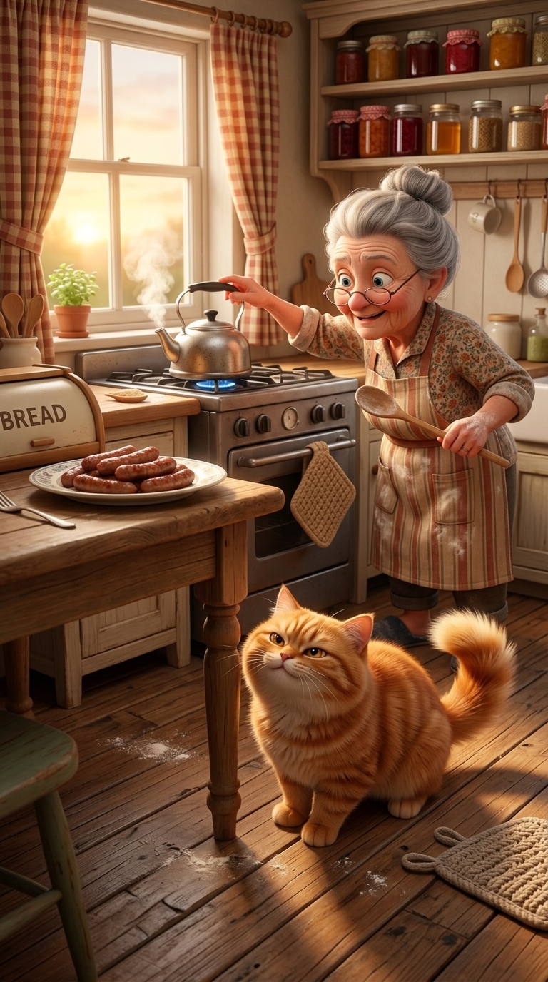 Art style: 3D Pixar. Уютная деревенская кухня ранним утром с клетчатыми занавесками, чайником на плите, банками варенья на полках, хлебницей и деревянным столом, где лежит тарелка с сосисками. Общий план с лёгкого нижнего ракурса, камера направлена к столу и окну. Тёплый золотистый свет восходящего солнца льётся через окно и мягко освещает комнату. Атмосфера домашняя, смешная и обещающая маленькое приключение. Бабушка Зина тянется к чайнику, а Рыжик снизу внимательно следит за тарелкой с хитрым прищуром. Палитра: тёплый янтарный, медовый, кремовый, рыжий, мягкий зелёный. ━━━━━━━━━━━━━━━━━━━━━━━━━━━━━━━━━━━━━━ FINAL STYLE ENFORCEMENT (this is the authoritative rendering directive — it overrides any style wording elsewhere in the prompt): Render this image entirely in "3D Pixar" style. Match the lighting grammar, material response, colour science, level of realism / stylisation, line weight, and shading model typical of "3D Pixar". Keep the subject, composition, camera angle, lighting direction, and colour palette from the description above — but EVERY surface, skin, fabric, material, and environmental element must be rendered in the "3D Pixar" idiom, not in any other medium. Character appearance reference (MUST match exactly): - Бабушка Зина: Strong rule: style --- 3D Pixar ---. Пожилая женщина около семидесяти лет, невысокая, подвижная, с круглым добрым лицом, выразительными морщинками от частого смеха, живыми глазами и чуть вздёрнутыми бровями. Аккуратная седая причёска, собранная в пучок, домашняя уютная одежда с фартуком, мягкие тапочки, заметные очки, которые всё время сползают. В руках может быть деревянная ложка или полотенце. Энергия озорная, тёплая, комедийная. Освещение мягкое тёплое кухонное. Фон — уютная домашняя кухня с занавесками, банками варенья, чайником и цветами на подоконнике. Детализированный мультипликационный портрет с выразительной мимикой. - Рыжик: Strong rule: style --- 3D Pixar ---. Упитанный рыжий кот среднего размера с пушистой шерстью, круглой мордочкой, выразительными янтарными глазами и важным, слегка наглым взглядом. Уши настороженные, усы длинные, хвост пышный и очень подвижный. На морде легко читаются удивление, хитрость и самодовольство. Общий образ обаятельный, комический, домашний. Без одежды, естественный кошачий облик. Освещение тёплое, с мягкими бликами на шерсти. Фон — уютная кухня или подоконник с цветочными горшками, миской и домашними мелочами. Персонаж должен выглядеть живым, эмоциональным и очень харизматичным. Детализированный мультипликационный портрет с акцентом на мимику и позу.