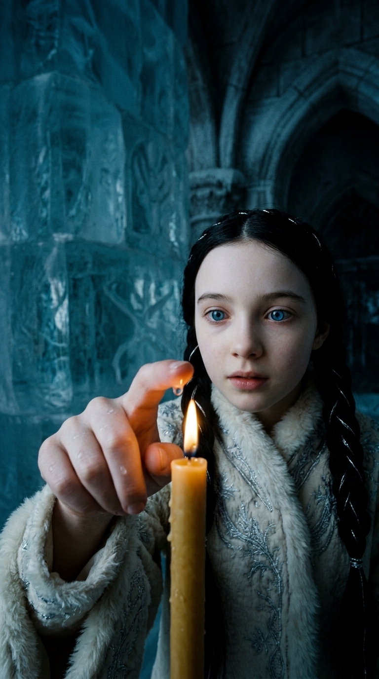 Strong rule: style --- Cinematic Realistic ---. A tall rigid woman in her 50s, ice-pale skin, silver-white hair pulled back severely, sharp pale grey eyes. Dressed in formal dark charcoal robes with stiff high collar. Posture perfectly upright, expression permanently disapproving. Icy ceremonial hall background. Cinematic dark Nordic fantasy realism.