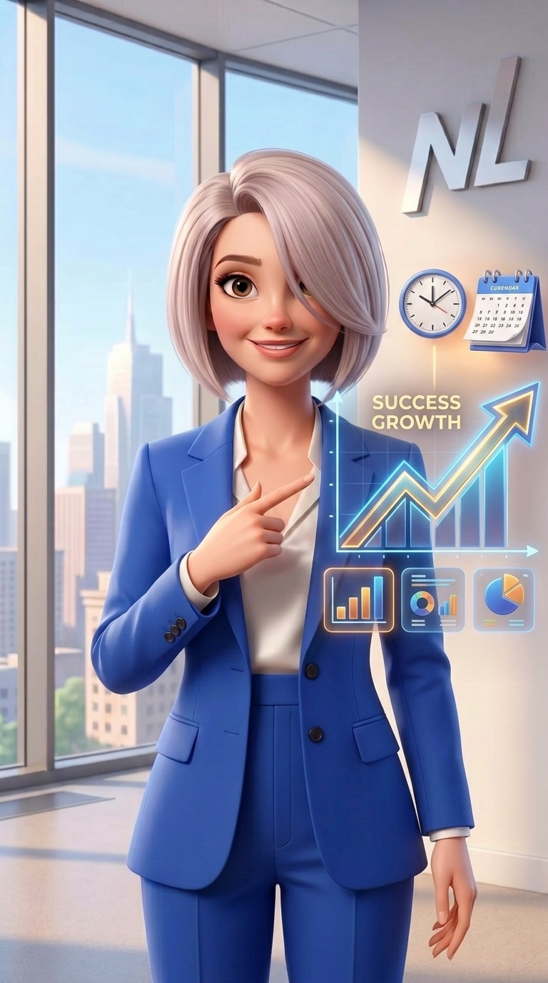 Art style: 3D Pixar. Анимационная инфографика. Появляется диаграмма роста, где стрелка устремляется вверх. На фоне иконки часов, календаря и графика. Ирина указывает на эту диаграмму. Стиль: 3D Pixar, элементы инфографики. ━━━━━━━━━━━━━━━━━━━━━━━━━━━━━━━━━━━━━━ FINAL STYLE ENFORCEMENT (this is the authoritative rendering directive — it overrides any style wording elsewhere in the prompt): Render this image entirely in "3D Pixar" style. Match the lighting grammar, material response, colour science, level of realism / stylisation, line weight, and shading model typical of "3D Pixar". Keep the subject, composition, camera angle, lighting direction, and colour palette from the description above — but EVERY surface, skin, fabric, material, and environmental element must be rendered in the "3D Pixar" idiom, not in any other medium. Character appearance reference (MUST match exactly): - Ирина Грекова: 3D-анимационный персонаж, молодая женщина около 30 лет со стройной фигурой и светлой кожей. У нее сердцевидное лицо, большие выразительные карие глаза и аккуратный нос. Волосы пепельно-платинового цвета, уложены в гладкое каре с длинной челкой, прикрывающей часть лба. Она одета в элегантный ярко-синий приталенный брючный костюм и белую атласную блузку с V-образным вырезом. Поза уверенная и профессиональная, руки мягко сцеплены в замок перед собой, на лице сияет дружелюбная и открытая улыбка.