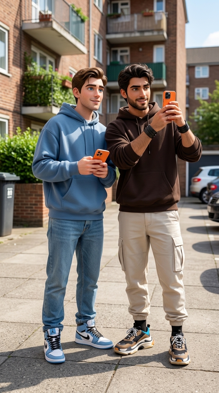 Art style: Реалистичная фотография, кинематографический ст.... Городской двор, солнечный день. Главный герой и его Друг стоят вместе, Друг держит телефон, готовый к съемке. Они смотрят в сторону, словно к ним кто то приближается. Средний план. Стиль — реалистичная кинематография. ━━━━━━━━━━━━━━━━━━━━━━━━━━━━━━━━━━━━━━ FINAL STYLE ENFORCEMENT (this is the authoritative rendering directive — it overrides any style wording elsewhere in the prompt): Render this image entirely in "Реалистичная фотография, кинематографический ст..." style. Match the lighting grammar, material response, colour science, level of realism / stylisation, line weight, and shading model typical of "Реалистичная фотография, кинематографический ст...". Keep the subject, composition, camera angle, lighting direction, and colour palette from the description above — but EVERY surface, skin, fabric, material, and environmental element must be rendered in the "Реалистичная фотография, кинематографический ст..." idiom, not in any other medium. Character appearance reference (MUST match exactly): - Главный герой: Strong rule: style --- Реалистичная фотография, кинематографический ст... ---. Молодой человек Альберто, 20-25 лет,глаза голубые одет в современную уличную одежду (худи, джинсы). , Одежда базовая но оверсайз, на ногах кеды найк джордан, Выражение лица вначале беззаботное и немного насмешливое, в руках айфон 17 про макс оранжевый , одет в цветовой палитре: #79A3C3 #3A2119 #D2E2EC, в стиле Cinematic 3D IllustrationA polished digital art style featuring smooth, high-fidelity textures and dramatic, warm cinematic lighting. It combines realistic character proportions with the expressive, clean aesthetic of modern 3D animation - Друг: Молодой мужчина лет двадцати с атлетическим телосложением, смуглой кожей и выразительными чертами лица. У него густые темно-каштановые волосы, уложенные в небрежную, объемную прическу, и аккуратная щетина. Карие глаза светятся радостью, на лице насмешливая улыбка, немного издевательская . Персонаж одет в оверсайз худи темно-коричневого цвета и светлые бежевые брюки-карго с массивными накладными карманами. На ногах — стильные многоцветные кроссовки на толстой подошве. Образ дополняют черные кожаные напульсники на обоих запястьях. Он стоит в динамичной позе, держа перед собой ярко-оранжевый смартфон. Brand guidelines: Brand color palette: #79A3C3, #3A2119, #D2E2EC, #EBCDB7, #957662. Use these colors prominently in the composition. Reference images context (match the visual style and elements from these): - Молодой человек Альберто, главный геройсо смартфоном (character): Молодой человек с каштановыми волосами и голубыми глазами в синей толстовке, держащий оранжевый смартфон. Изображение выполнено в стиле современной 3D-анимации с мягким освещением и дружелюбной атмосферой. - Молодой человек Даниял друг главного героя в стиле 3D-анимации (character): Молодой человек с каштановыми волосами и зелеными глазами, одетый в коричневую толстовку, делает селфи на фоне городского пейзажа на закате. Изображение выполнено в стиле современной 3D-анимации с мягким освещением и детализированными текстурами.