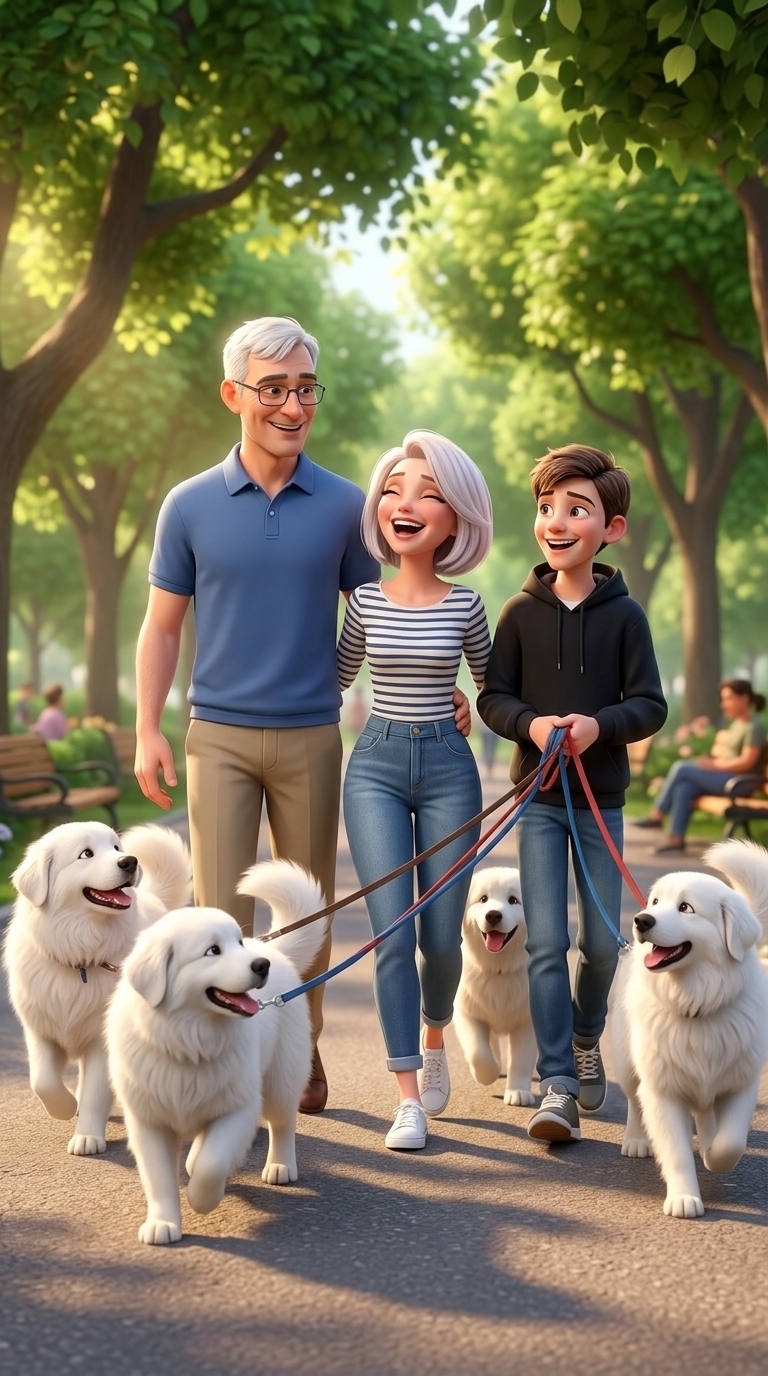 Art style: 3D Pixar. Ирина одетая в повседневную одежду гуляет в парке с мужем,, муж выше нее на голову и сыном 16 лет ростом с Ирину и 5 собаками собаки белые , все в 3D-стиле). Они смеются и счастливо проводят время вместе. Солнечный, теплый день. Стиль: 3D Pixar. ━━━━━━━━━━━━━━━━━━━━━━━━━━━━━━━━━━━━━━ FINAL STYLE ENFORCEMENT (this is the authoritative rendering directive — it overrides any style wording elsewhere in the prompt): Render this image entirely in "3D Pixar" style. Match the lighting grammar, material response, colour science, level of realism / stylisation, line weight, and shading model typical of "3D Pixar". Keep the subject, composition, camera angle, lighting direction, and colour palette from the description above — but EVERY surface, skin, fabric, material, and environmental element must be rendered in the "3D Pixar" idiom, not in any other medium. Character appearance reference (MUST match exactly): - Ирина Грекова: 3D-анимационный персонаж, молодая женщина около 30 лет со стройной фигурой и светлой кожей. У нее сердцевидное лицо, большие выразительные карие глаза и аккуратный нос. Волосы пепельно-платинового цвета, уложены в гладкое каре с длинной челкой, прикрывающей часть лба. Она одета в элегантный ярко-синий приталенный брючный костюм и белую атласную блузку с V-образным вырезом. Поза уверенная и профессиональная, руки мягко сцеплены в замок перед собой, на лице сияет дружелюбная и открытая улыбка. Reference images context (match the visual style and elements from these): - муж (character): Портрет пожилого мужчины с седыми волосами и в очках, одетого в черную рубашку. Он задумчиво подпирает голову рукой на фоне размытого классического интерьера. - сын 16 лет (character): Молодой человек в черном гоночном костюме с логотипами спонсоров, кепке Yokohama и солнцезащитных очках стоит на фоне гоночного трека и автомобиля. Его поза уверенная, руки скрещены на груди, создавая образ профессионального спортсмена. - собака крупнее (character): Женщина в ярко-розовом платье демонстрирует крупную белую пушистую собаку на профессиональной выставке. Сцена происходит в помещении с фиолетовым ковром и зрителями на заднем плане. - собака чуть поменьше (character): Женщина в розовом полосатом костюме позирует с крупной белой собакой на фоне парковой аллеи. У их ног лежат призовые розетки и кубок, подчеркивая атмосферу успеха на выставке собак.
