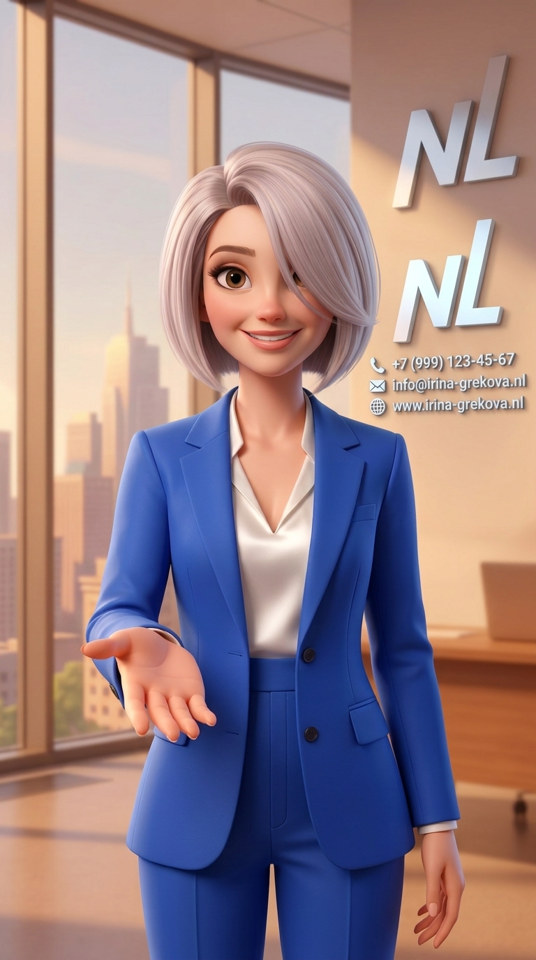 Art style: 3D Pixar. Крупный план: Ирина Грекова снова в деловом костюме, как в первой сцене. Она протягивает руку к камере, как бы приглашая зрителя. На фоне появляется анимированный логотип NL и контактная информация. Стиль: 3D Pixar. ━━━━━━━━━━━━━━━━━━━━━━━━━━━━━━━━━━━━━━ FINAL STYLE ENFORCEMENT (this is the authoritative rendering directive — it overrides any style wording elsewhere in the prompt): Render this image entirely in "3D Pixar" style. Match the lighting grammar, material response, colour science, level of realism / stylisation, line weight, and shading model typical of "3D Pixar". Keep the subject, composition, camera angle, lighting direction, and colour palette from the description above — but EVERY surface, skin, fabric, material, and environmental element must be rendered in the "3D Pixar" idiom, not in any other medium. Character appearance reference (MUST match exactly): - Ирина Грекова: 3D-анимационный персонаж, молодая женщина около 30 лет со стройной фигурой и светлой кожей. У нее сердцевидное лицо, большие выразительные карие глаза и аккуратный нос. Волосы пепельно-платинового цвета, уложены в гладкое каре с длинной челкой, прикрывающей часть лба. Она одета в элегантный ярко-синий приталенный брючный костюм и белую атласную блузку с V-образным вырезом. Поза уверенная и профессиональная, руки мягко сцеплены в замок перед собой, на лице сияет дружелюбная и открытая улыбка.