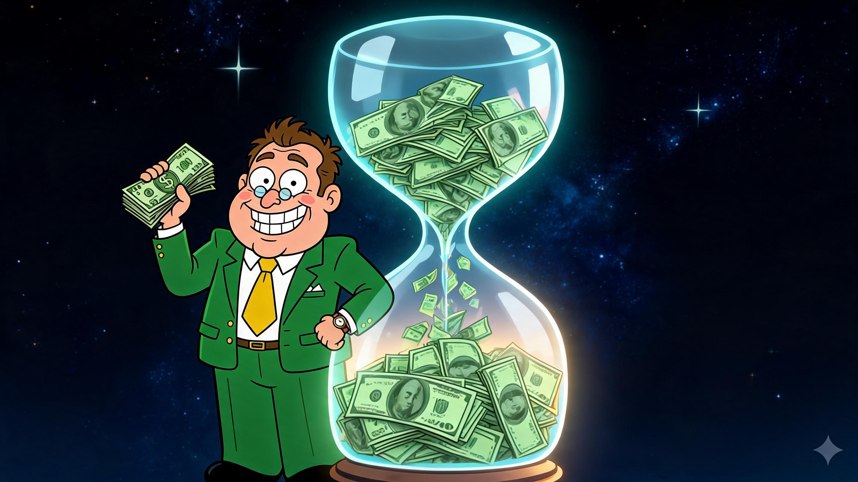 Art style: Family Guy style 2D animation, vibrant colors, caricature of a financial expert, clean vector lines, high contrast, 4K resolution, professional motion graphics.. A vast, dark cosmic void with a massive glowing glass hourglass. Instead of sand, crisp green hundred-dollar bills spiral down from the top bulb to the bottom. Nick stands confidently to the left, leaning one hand against the glass. Low-angle shot, dramatic teal and orange backlighting. The scene feels high-stakes and surreal with deep shadows and vibrant metallic highlights. ━━━━━━━━━━━━━━━━━━━━━━━━━━━━━━━━━━━━━━ FINAL STYLE ENFORCEMENT (this is the authoritative rendering directive — it overrides any style wording elsewhere in the prompt): Render this image entirely in "Family Guy style 2D animation, vibrant colors, caricature of a financial expert, clean vector lines, high contrast, 4K resolution, professional motion graphics." style. Match the lighting grammar, material response, colour science, level of realism / stylisation, line weight, and shading model typical of "Family Guy style 2D animation, vibrant colors, caricature of a financial expert, clean vector lines, high contrast, 4K resolution, professional motion graphics.". Keep the subject, composition, camera angle, lighting direction, and colour palette from the description above — but EVERY surface, skin, fabric, material, and environmental element must be rendered in the "Family Guy style 2D animation, vibrant colors, caricature of a financial expert, clean vector lines, high contrast, 4K resolution, professional motion graphics." idiom, not in any other medium. Character appearance reference (MUST match exactly): - Nick: Мужчина средних лет плотного телосложения с круглым лицом, двойным подбородком и румяными щеками. У него короткие, слегка взъерошенные каштановые волосы и маленькие круглые очки на крупном носу. Он одет в ярко-зеленый пиджак с золотыми пуговицами, белую рубашку и широкий желтый галстук. На левом запястье видны золотые часы. Персонаж широко и восторженно улыбается, демонстрируя ровные белые зубы. Он стоит в уверенной позе, высоко подняв в одной руке веер из стодолларовых купюр, а другую руку положив на бедро.