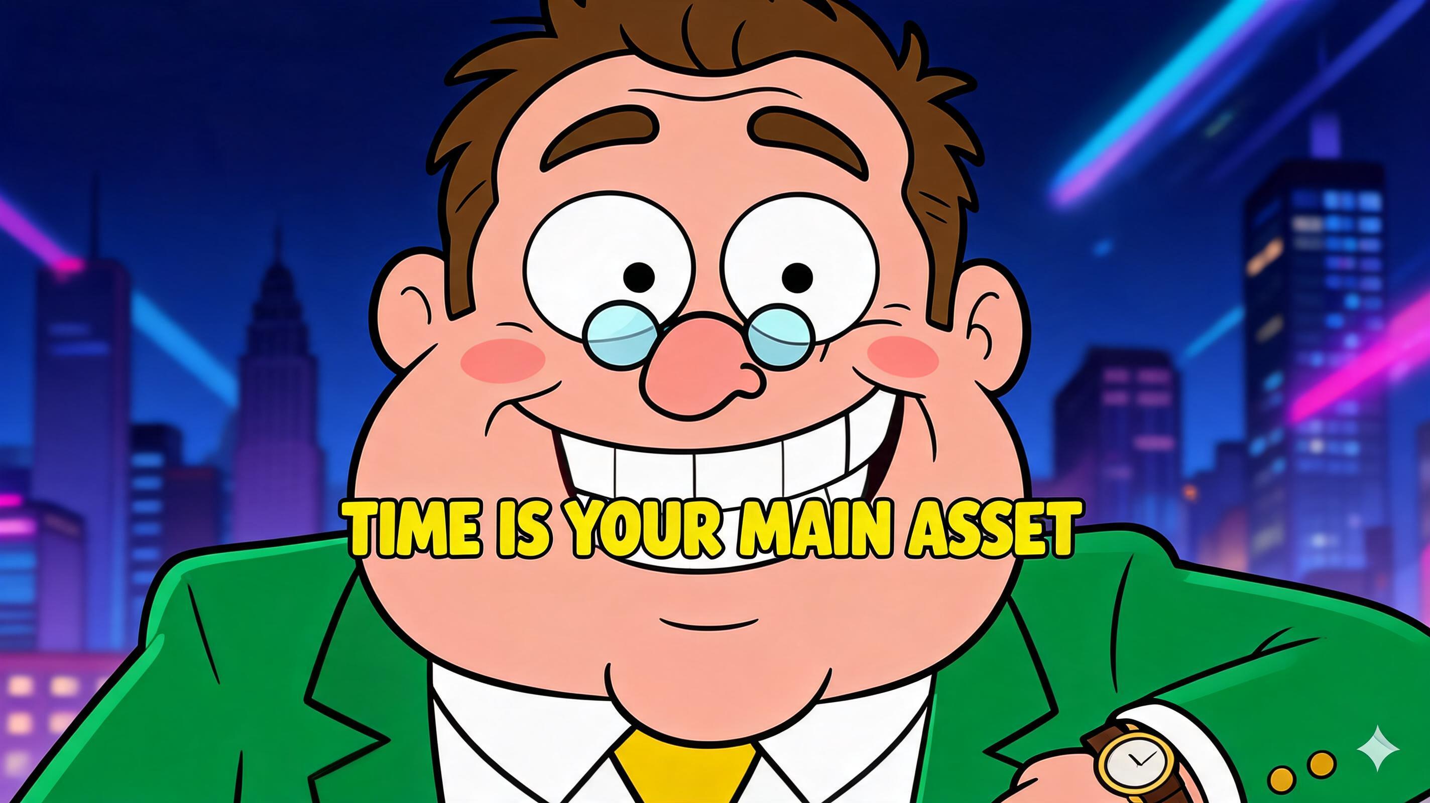 Art style: Family Guy style 2D animation, vibrant colors, caricature of a financial expert, clean vector lines, high contrast, 4K resolution, professional motion graphics.. Extreme close-up of Nick’s face, his eyes sharp and focused. Bold, vibrant yellow text reading 'TIME IS YOUR MAIN ASSET' floats in the air in front of him. The background is a blurred, high-contrast urban night scene with streaks of neon purple and blue. The lighting is harsh and direct, emphasizing his determined expression. ━━━━━━━━━━━━━━━━━━━━━━━━━━━━━━━━━━━━━━ FINAL STYLE ENFORCEMENT (this is the authoritative rendering directive — it overrides any style wording elsewhere in the prompt): Render this image entirely in "Family Guy style 2D animation, vibrant colors, caricature of a financial expert, clean vector lines, high contrast, 4K resolution, professional motion graphics." style. Match the lighting grammar, material response, colour science, level of realism / stylisation, line weight, and shading model typical of "Family Guy style 2D animation, vibrant colors, caricature of a financial expert, clean vector lines, high contrast, 4K resolution, professional motion graphics.". Keep the subject, composition, camera angle, lighting direction, and colour palette from the description above — but EVERY surface, skin, fabric, material, and environmental element must be rendered in the "Family Guy style 2D animation, vibrant colors, caricature of a financial expert, clean vector lines, high contrast, 4K resolution, professional motion graphics." idiom, not in any other medium. Character appearance reference (MUST match exactly): - Nick: Мужчина средних лет плотного телосложения с круглым лицом, двойным подбородком и румяными щеками. У него короткие, слегка взъерошенные каштановые волосы и маленькие круглые очки на крупном носу. Он одет в ярко-зеленый пиджак с золотыми пуговицами, белую рубашку и широкий желтый галстук. На левом запястье видны золотые часы. Персонаж широко и восторженно улыбается, демонстрируя ровные белые зубы. Он стоит в уверенной позе, высоко подняв в одной руке веер из стодолларовых купюр, а другую руку положив на бедро.