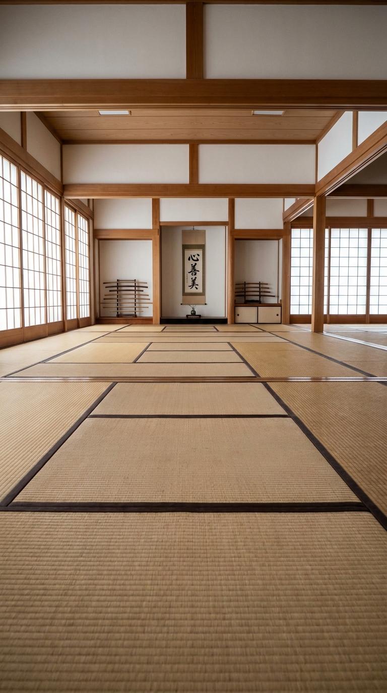 Art style: Cinematic Realistic. Спокойный чистый додзё, татами ровными полосами уходят в глубину кадра, пространство снова становится симметричным и уравновешенным, как в начале ━━━━━━━━━━━━━━━━━━━━━━━━━━━━━━━━━━━━━━ FINAL STYLE ENFORCEMENT (this is the authoritative rendering directive — it overrides any style wording elsewhere in the prompt): Render this image entirely in "Cinematic Realistic" style. Match the lighting grammar, material response, colour science, level of realism / stylisation, line weight, and shading model typical of "Cinematic Realistic". Keep the subject, composition, camera angle, lighting direction, and colour palette from the description above — but EVERY surface, skin, fabric, material, and environmental element must be rendered in the "Cinematic Realistic" idiom, not in any other medium.