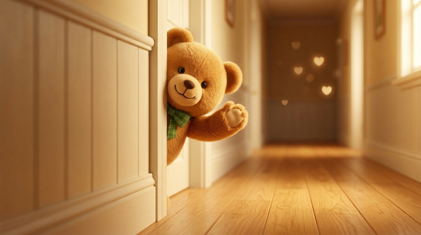 Art style: Милая 3D-анимация в стиле Pixar, яркие и теплые.... Пустой коридор. Из-за дверного косяка, куда убежала Габриэлла, выглядывает голова плюшевого мишки из рюкзака. Он машет лапой на прощание. ━━━━━━━━━━━━━━━━━━━━━━━━━━━━━━━━━━━━━━ FINAL STYLE ENFORCEMENT (this is the authoritative rendering directive — it overrides any style wording elsewhere in the prompt): Render this image entirely in "Милая 3D-анимация в стиле Pixar, яркие и теплые..." style. Match the lighting grammar, material response, colour science, level of realism / stylisation, line weight, and shading model typical of "Милая 3D-анимация в стиле Pixar, яркие и теплые...". Keep the subject, composition, camera angle, lighting direction, and colour palette from the description above — but EVERY surface, skin, fabric, material, and environmental element must be rendered in the "Милая 3D-анимация в стиле Pixar, яркие и теплые..." idiom, not in any other medium. Reference images context (match the visual style and elements from these): - Маленькая девочка с кудрявыми волосами (character): Милая 3D-анимированная девочка с длинными золотистыми кудрями, зелеными глазами и веснушками, одетая в розовое платье, машет рукой на фоне с сердечками и искрами. - Персонаж: Удивленная женщина (character): Анимационный персонаж в стиле 3D с пышными светлыми кудрями, одетая в голубую рубашку и джинсы, выражает восторг на фоне уютной кухни. Освещение теплое и мягкое, создающее радостную и домашнюю атмосферу.