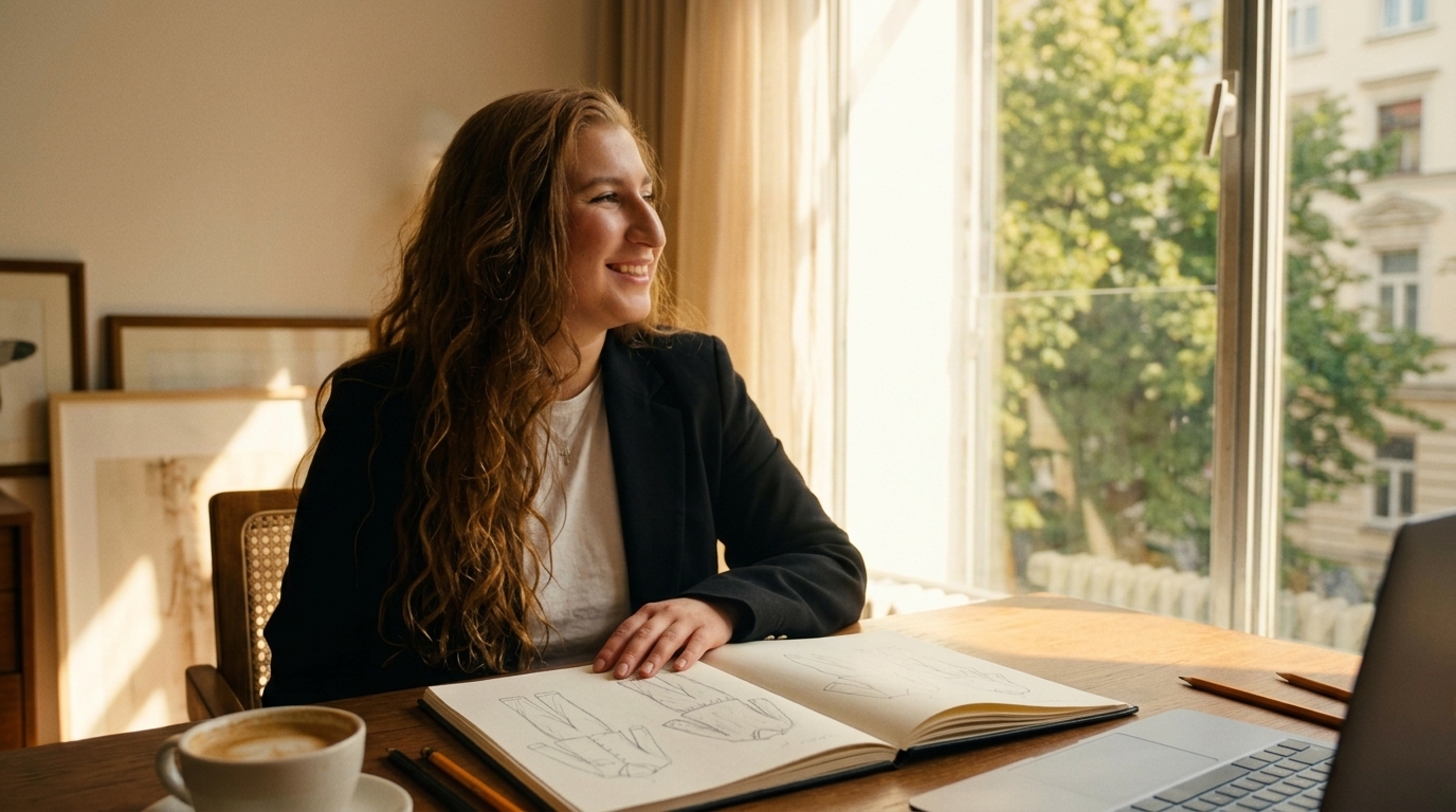 Art style: Реалистичная кинематография, теплые, уютные тон.... Ира сидит за своим рабочим столом. Перед ней лежит скетчбук с новыми эскизами пижам. Она с улыбкой смотрит в окно, где уже светит яркое солнце. Она полна идей и уверенности в будущем. ━━━━━━━━━━━━━━━━━━━━━━━━━━━━━━━━━━━━━━ FINAL STYLE ENFORCEMENT (this is the authoritative rendering directive — it overrides any style wording elsewhere in the prompt): Render this image entirely in "Реалистичная кинематография, теплые, уютные тон..." style. Match the lighting grammar, material response, colour science, level of realism / stylisation, line weight, and shading model typical of "Реалистичная кинематография, теплые, уютные тон...". Keep the subject, composition, camera angle, lighting direction, and colour palette from the description above — but EVERY surface, skin, fabric, material, and environmental element must be rendered in the "Реалистичная кинематография, теплые, уютные тон..." idiom, not in any other medium. Reference images context (match the visual style and elements from these): - Молодая женщина в черном пиджаке (character): Женщина с длинными вьющимися волосами в белой футболке и черном блейзере позирует в интерьере с пианино и настенным декором. Мягкий теплый свет подчеркивает уютную и профессиональную обстановку.
