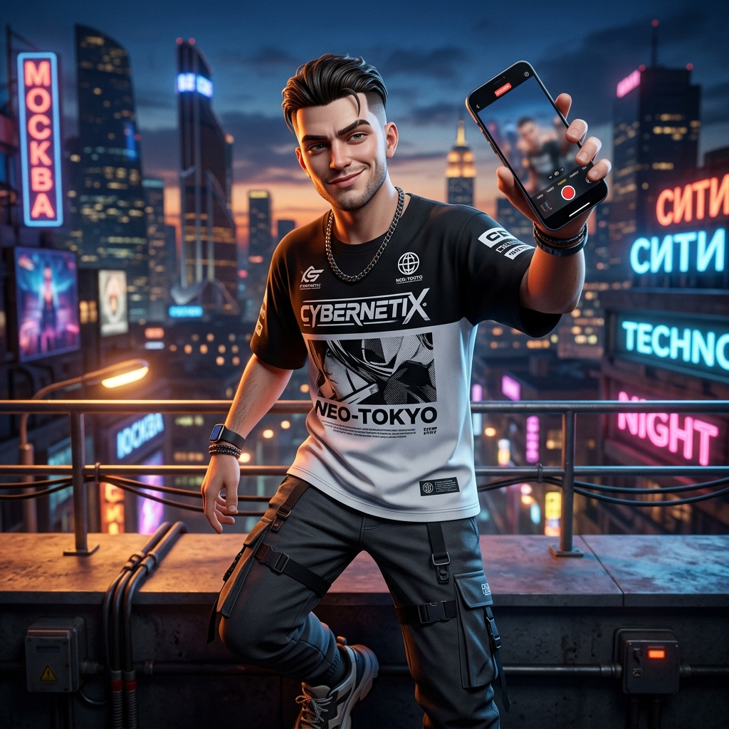 Strong rule: style --- Cinematic 3D Illustration. Гладкий цифровой худ... ---. Ровесник Артема, 18-20 лет. Выглядит более дерзко: стильная стрижка, брендовая футболка оверсайз. На лице постоянно играет самоуверенная ухмылка. Он держит в руках смартфон для съемки видео. Стиль Cinematic 3D Illustration.